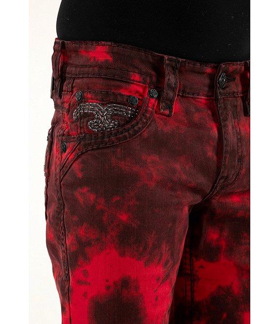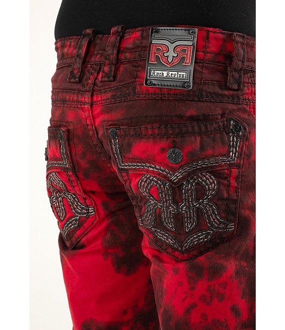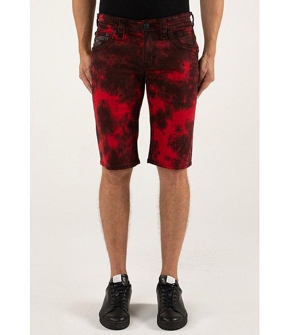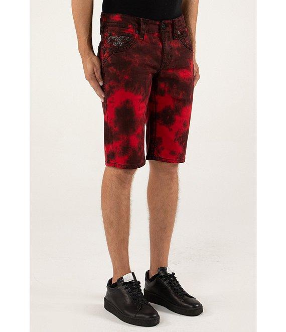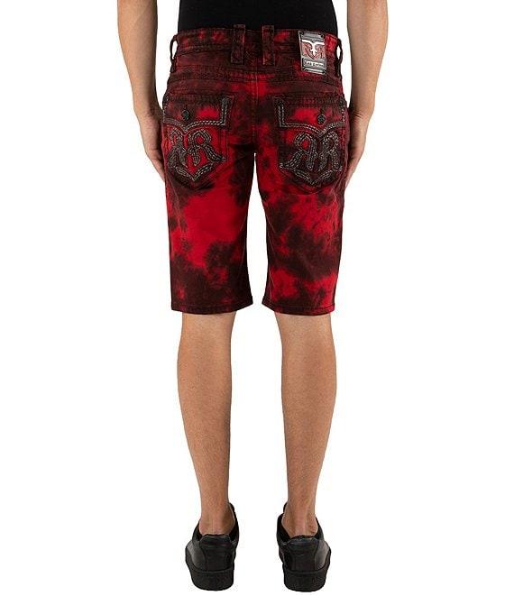 From Rock Revival, these shorts feature: Tie-dye design Belt loops Zip/button-front closure Matte-color buttons and rivet decorations throughout Two front pockets (with fleur-de-lis design on the coin pocket) Classic double "RR" logo on the back button-flap pockets with metallic stitching detail and black leather accents Black/red leather belt loop patch Approx. 13" inseam Cotton/elastane Machine wash/tumble dry Imported.