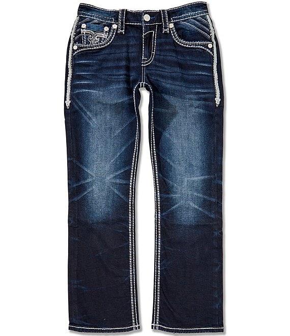 From Rock Revival, these jeans feature: Mid rise Zip/button front closure Belt loops 5-pocket jeans 2 front pockets (1 with coin pocket) 2 back pockets Custom pewter hardware and rivets Engraved 'Rock Revival' leather waist patch 32" inseam Bootcut legs Cotton/elastane stretch denim for comfort and durability Machine wash/tumble dry Imported.