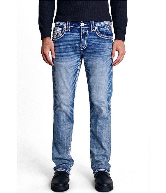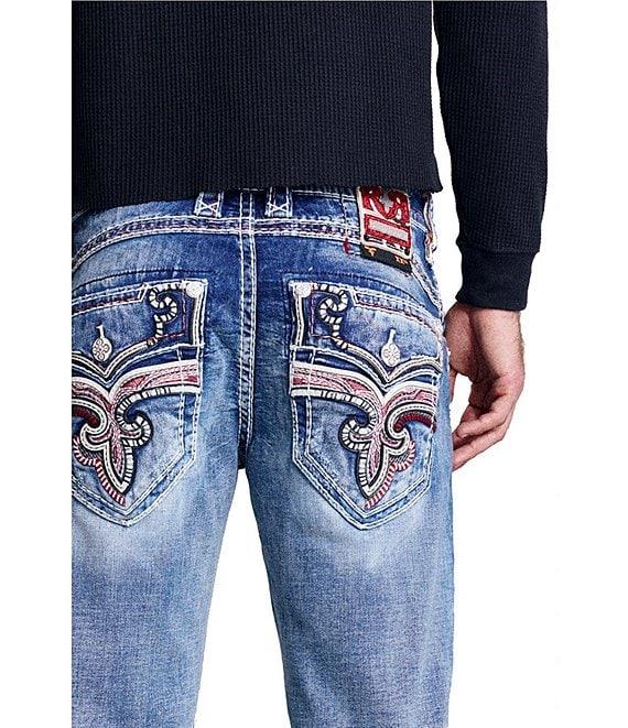 From Rock Revival, these jeans feature: Mid rise Zip-front closure Belt loops 5-pocket jeans 2 front pockets (1 with coin pocket) 2 back button-flap pockets with red/white/black fleur-de-lis embroidery Contrast stitching detail and engraved "Rock Revival" leather waist patch 32" inseam Straight legs Pewter hardware Triple-stitched seams Hand-sanded fading "Whiskering" effect Natural distressed detail Cotton/elastane denim Machine wash/tumble dry Imported.