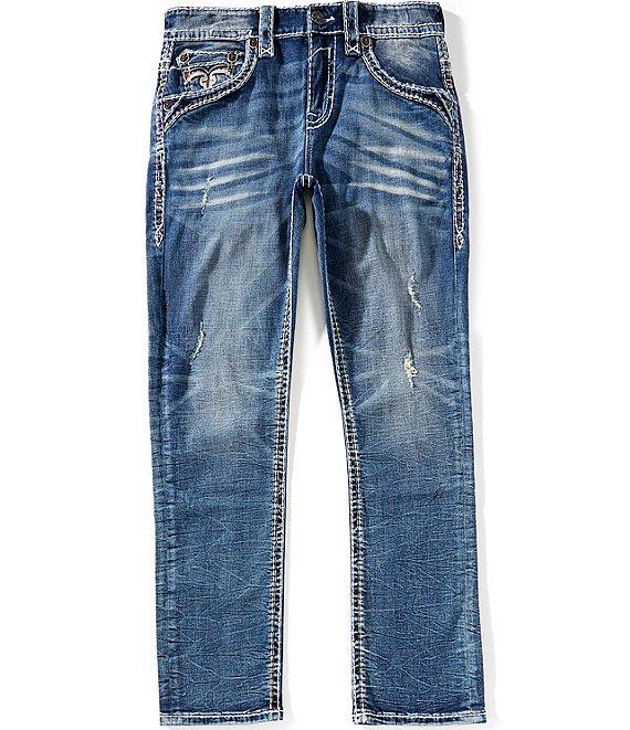 From Rock Revival, these jeans features: Mid rise Zip/button front closure Belt loops 5-pocket jeans 2 front pockets (1 with coin pocket) 2 back button-flap pockets Inverted fleur-de-lis embroidery Engraved 'Rock Revival' leather waist patch Custom pewter hardware and rivets 32" inseam Straight legs Cotton/elastane stretch denim for comfort and durability Machine wash/tumble dry Imported.