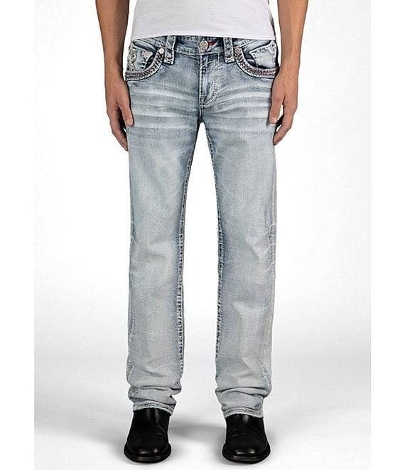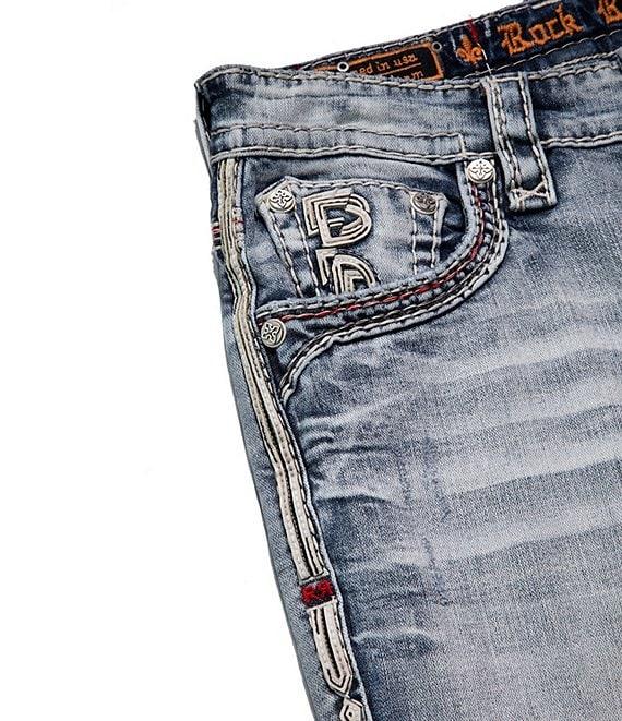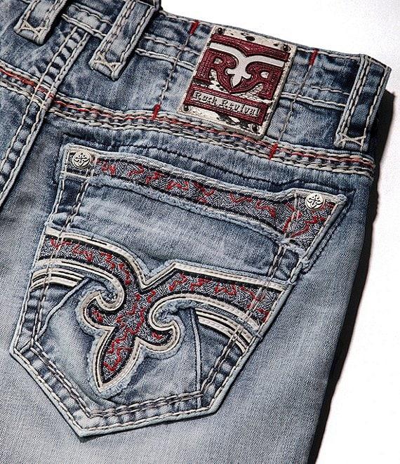 From Rock Revival, these jeans feature: Mid rise Belt loops Zip/button-front closure 5-pocket jeans Straight legs 2 front pockets (1 with coin pocket) Multicolor fleur-de-lis embroidery and contrast red stitching on the back pockets Engraved “Rock Revival” leather waist patch Custom pewter hardware Engraved rivets Decorative cross-back yoke detail Triple-stitched seams for added durability Premium stretch denim with a soft, lived-in texture and hand-sanded fading Cotton/elastane Machine wash/tumble dry Imported.