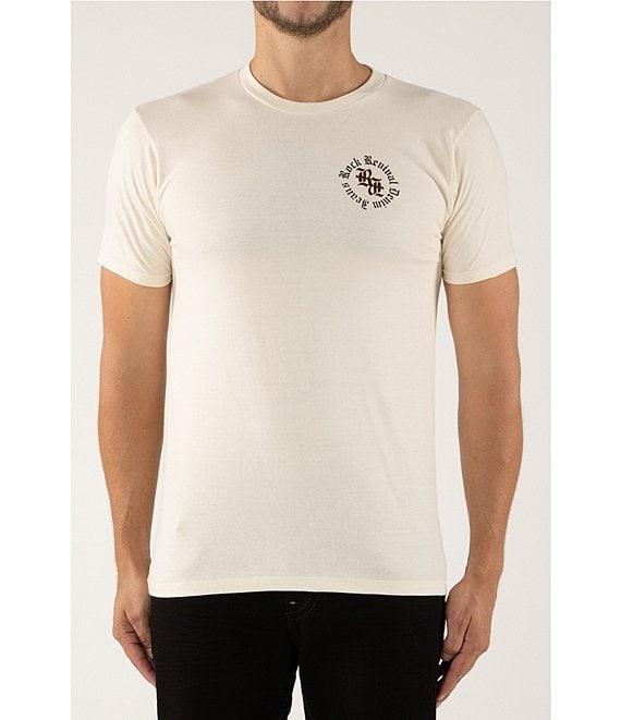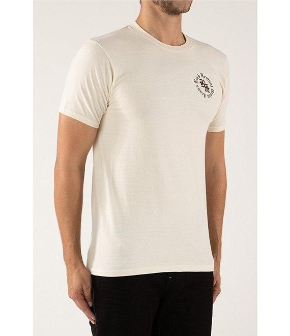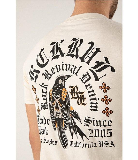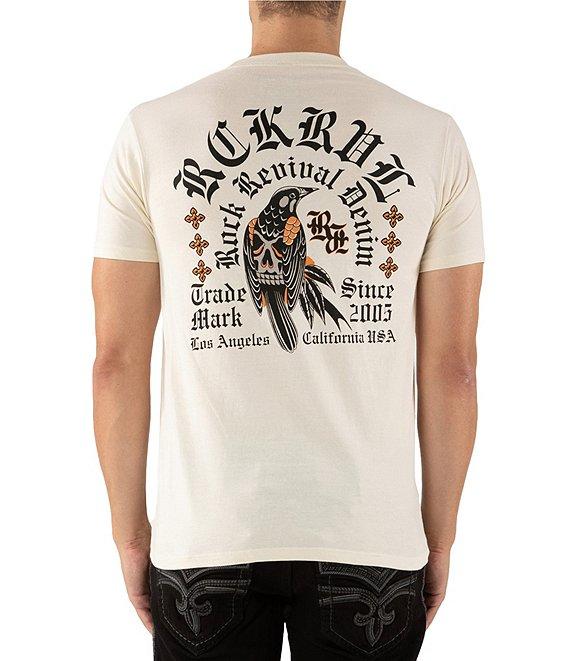 From Rock Revival, this T-shirt features: Crew neckline Short sleeves Circle-shaped graphic with "Rock Revial Denim Jeans" logo and "RR" initials on the chest Large "Rock Revival" multi-logo graphic with a crow "resembling" a skull on the back Pullover styling Cotton Machine wash/tumble dry Imported.