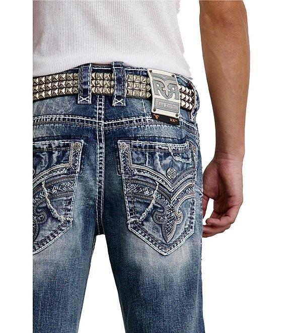 From Rock Revival, these jeans feature: Mid rise Zip-front closure Belt loops 5 pocket jeans 2 front pockets (1 with coin pocket) Tonal contrast stitching, textured embroidery and metal hardware that frames the "RR" signature detailed back pockets Full length Straight legs Heavy distressing Sanded whiskering and shredding throughout the front for a lived-in look Approx. 32" inseam Cotton/elastane denim Machine wash/tumble dry Imported.