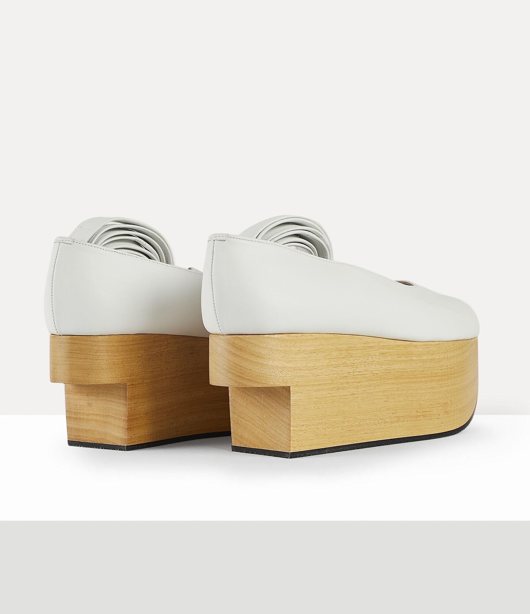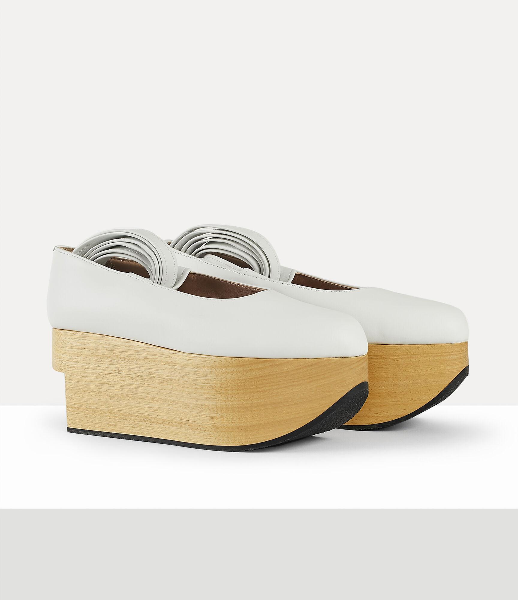 Our Rocking Horse Ballerina shoes were first revealed in the Vivienne Westwood Autumn-Winter ‘87/88 'Harris Tweed' collection, designed to achieve poise and movement. The curved front and cut-out detail in the high wooden platform allows the wearer to rock forwards as they walk, while the delicate leather tie ribbons draw inspiration from ballet pointe shoes.