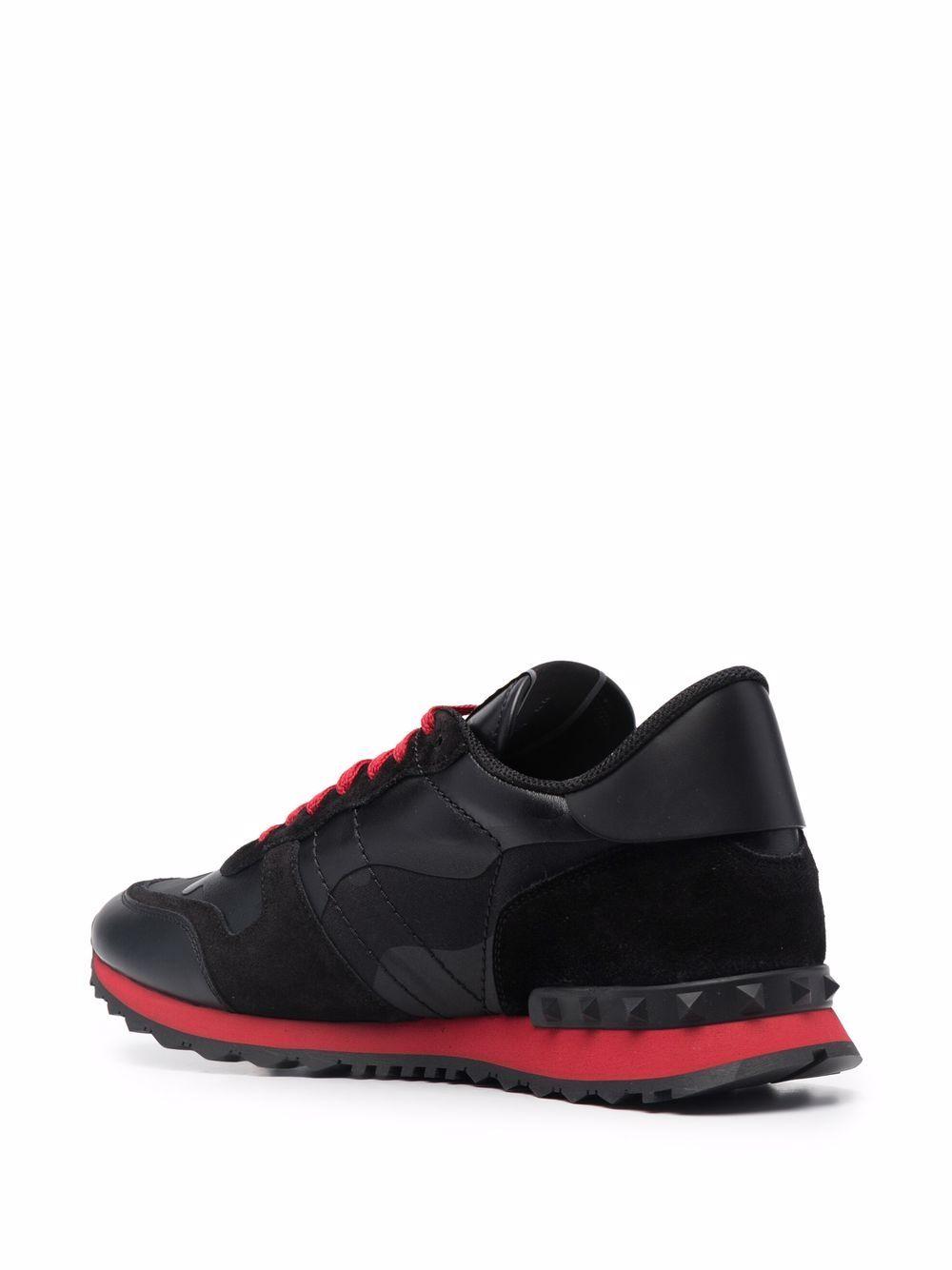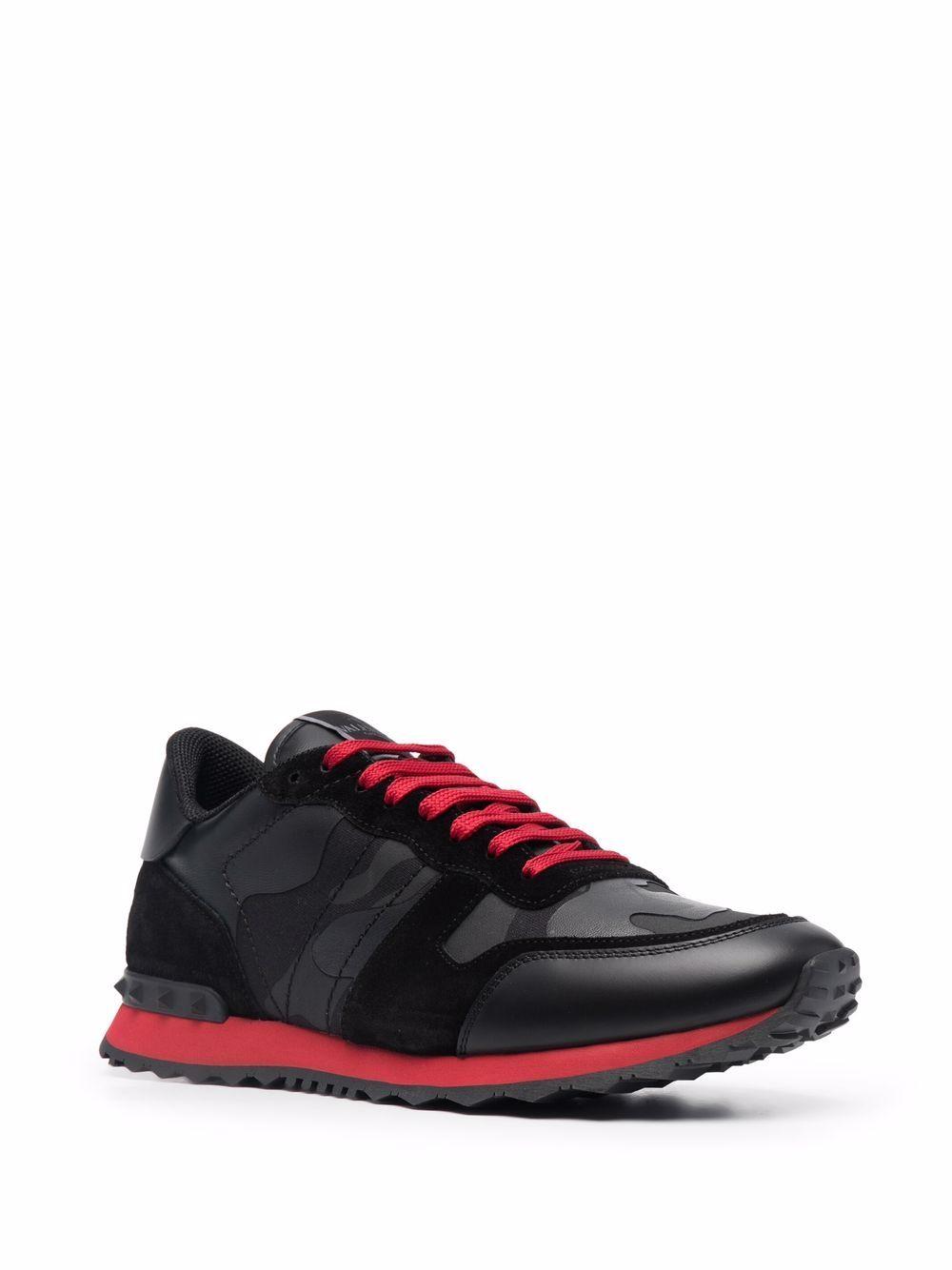 Crafted from sleek leather and adorned with a camouflage pattern these Rockrunner low-top sneakers from Valentino Garavani exude muted elegance. Crafted from cotton and lambskin, they are presented in a black and red colourway.