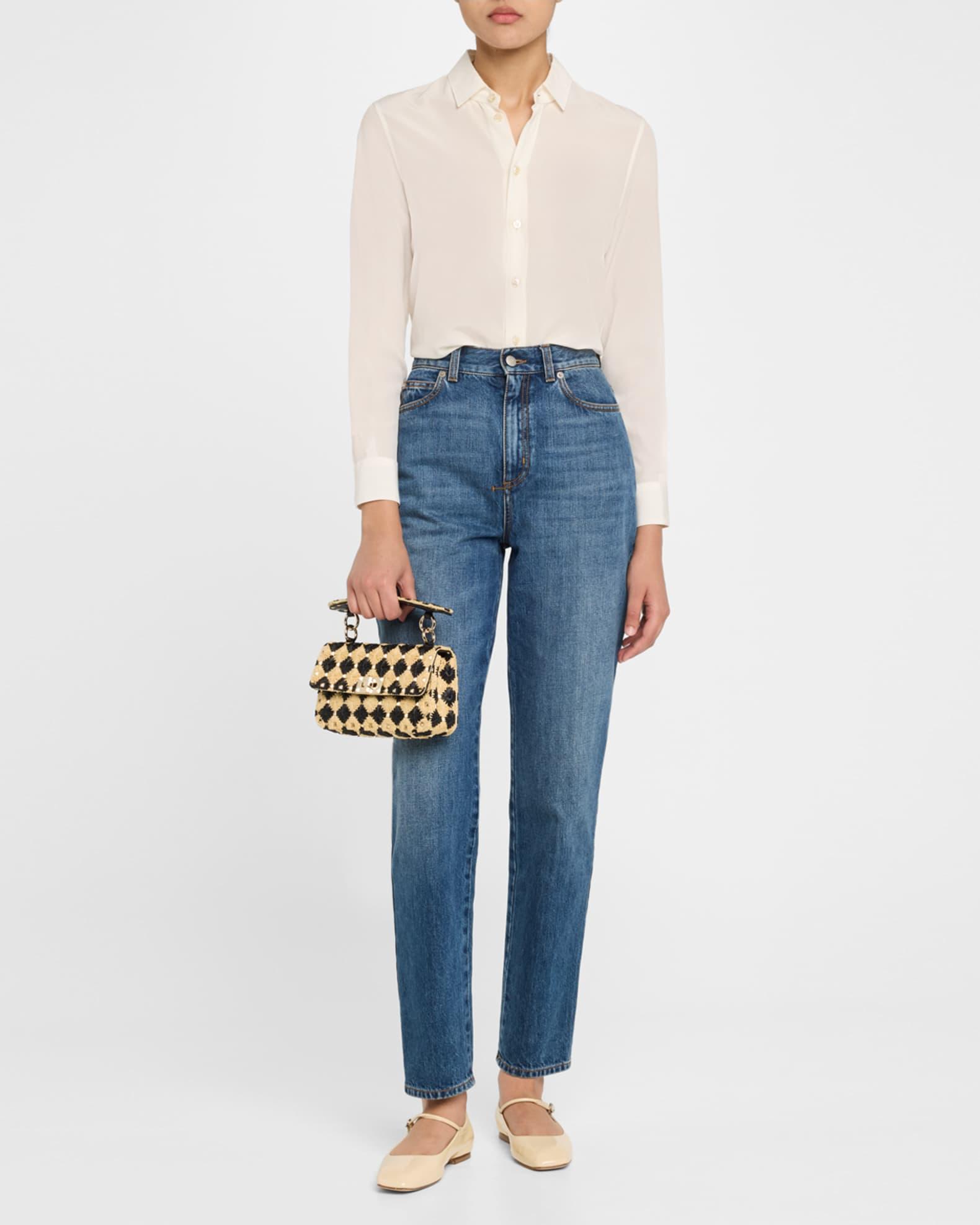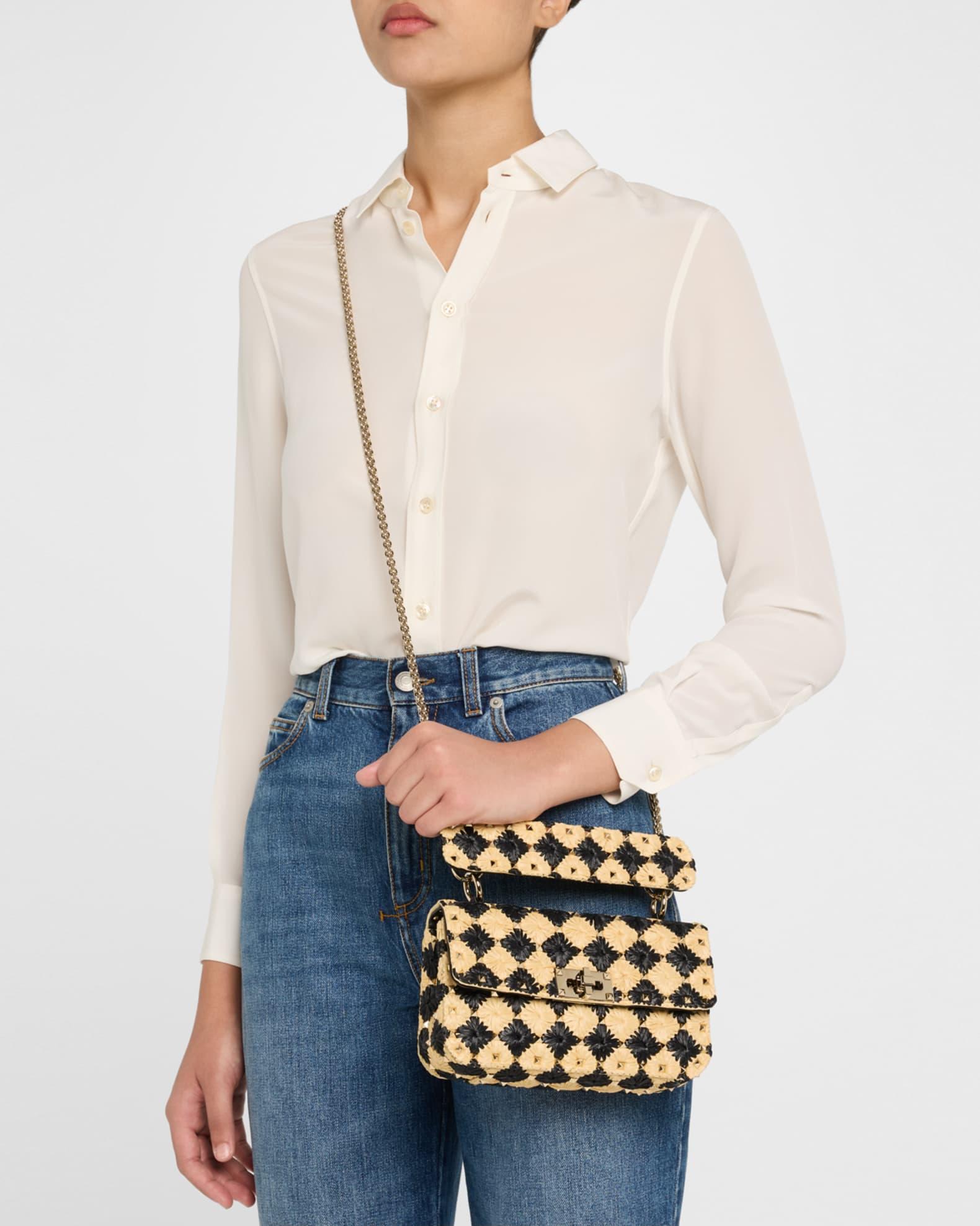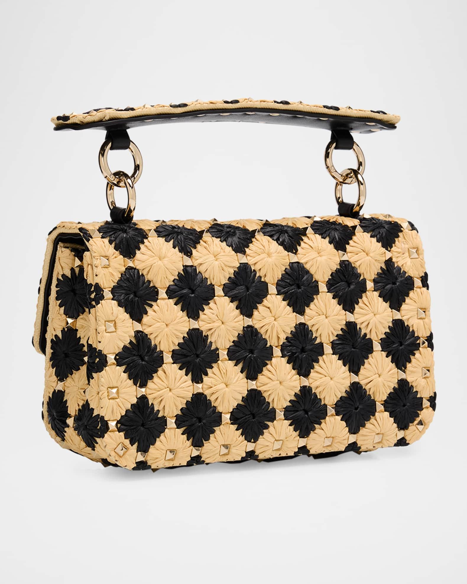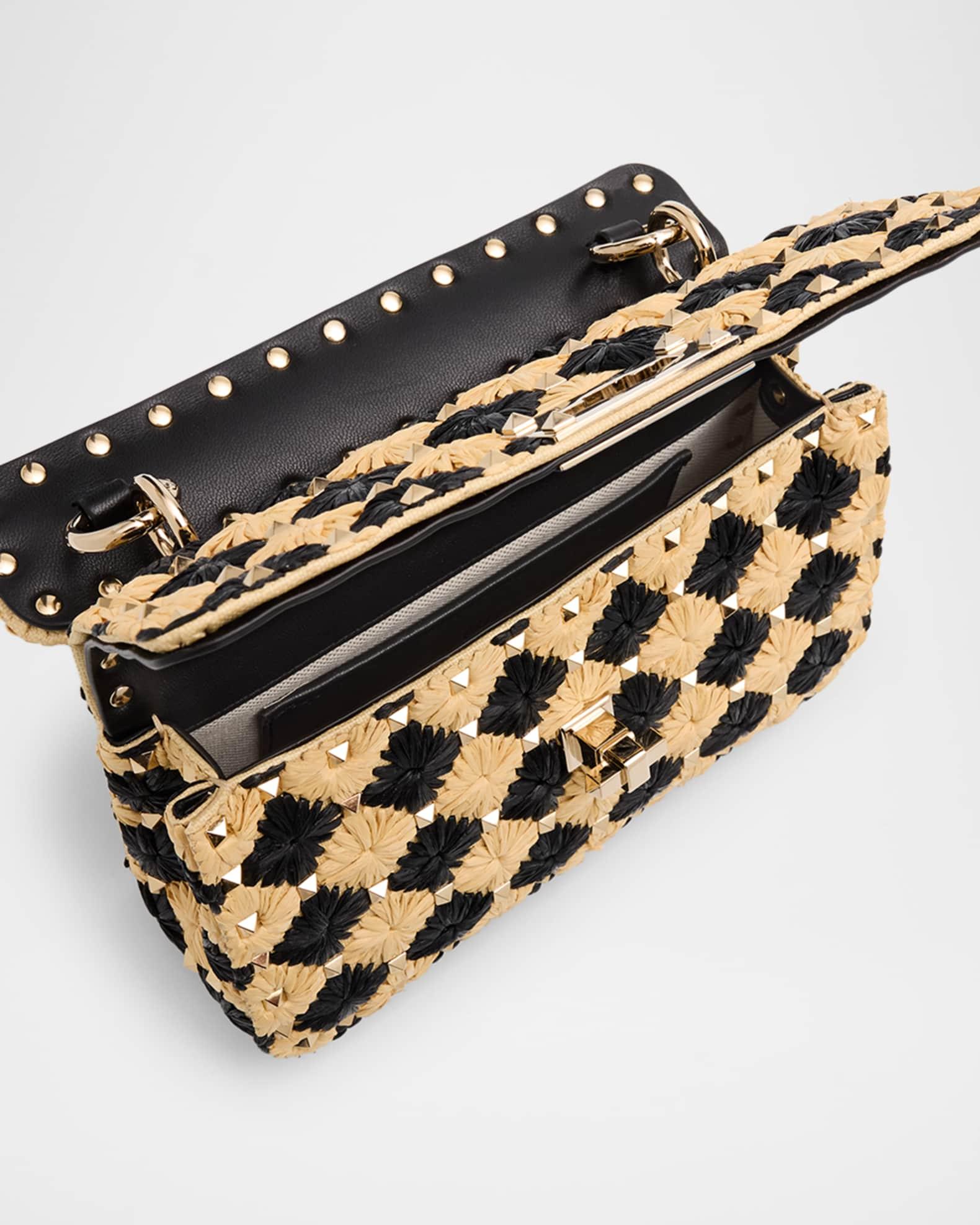 Valentino Garavani checkered woven raffia-like fabric and leather shoulder bag signature Rockstuds Detachable chain shoulder strap Can be worn as a top handle or shoulder bag Flat top handle anchored by metal rings Flap top with turn-lock closure Interior, one slip pocket Approx. 5.5"H x 7.1"W x 3.2"D Nylon Made in Italy