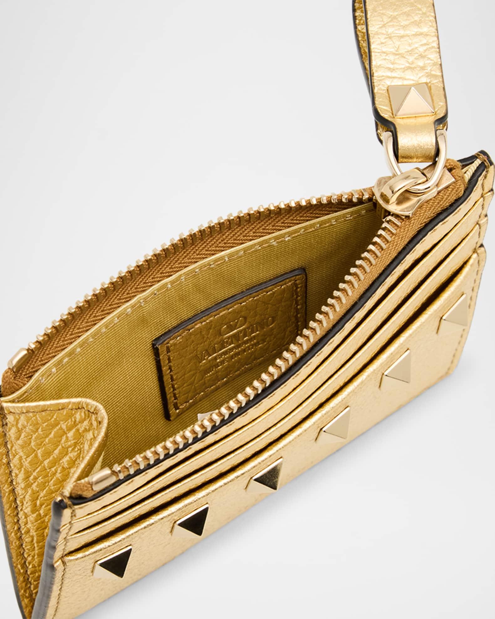 Valentino Garavani metallic leather card case with signature Rockstuds Zip top closure Exterior, six card slots Approx. 3.1"H x 4.3"W Made in Italy