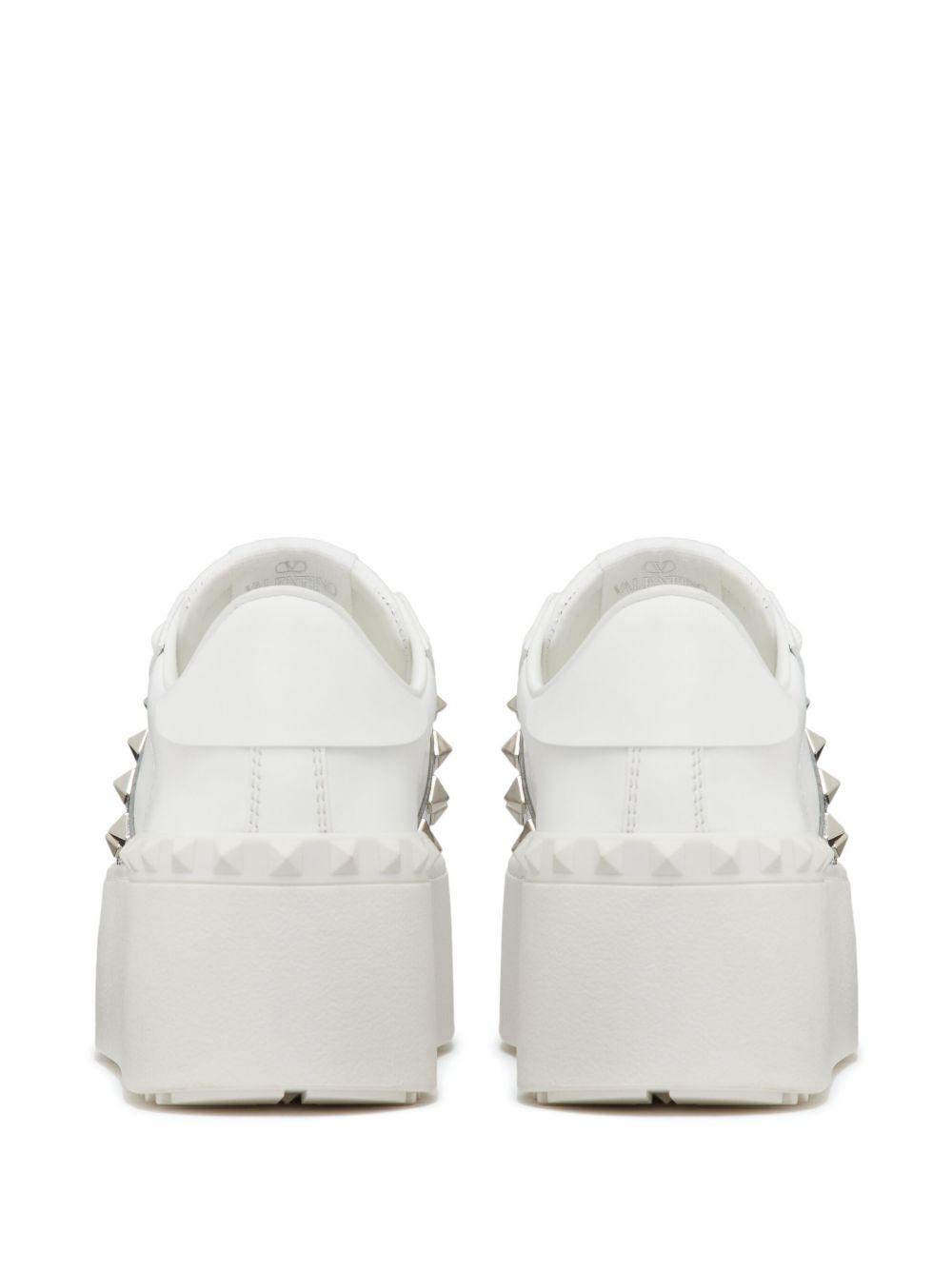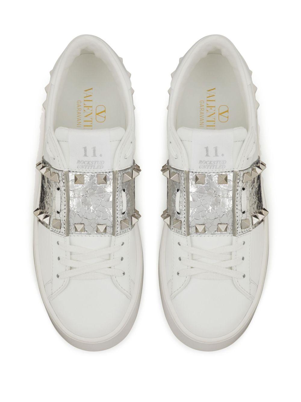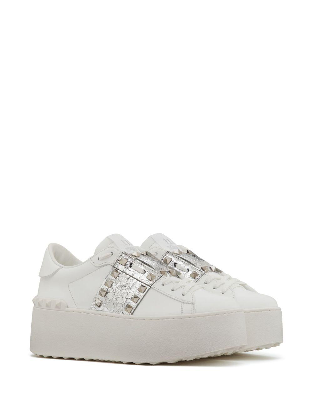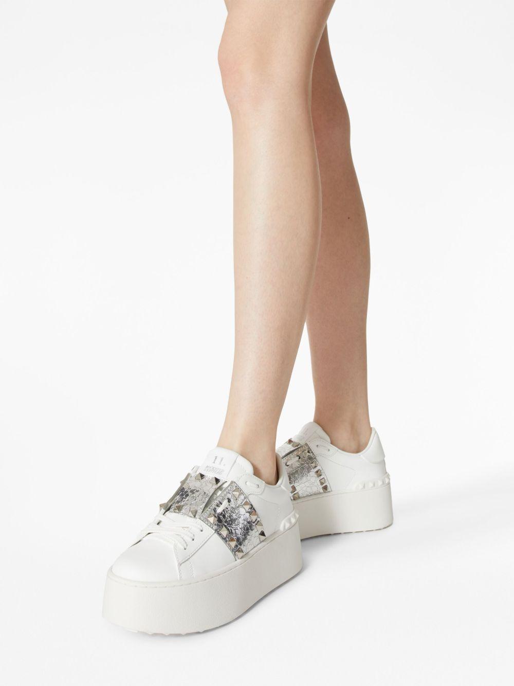 Valentino Garavani Rockstud Untitled metallic flatform sneakers | White | white/silver-tone | calf leather | signature Rockstud embellishment | front lace-up fastening | round toe | platform sole | metallic effect | colour-block panelled design | Leather | Low-Tops | Trainers | Shoes | Women
