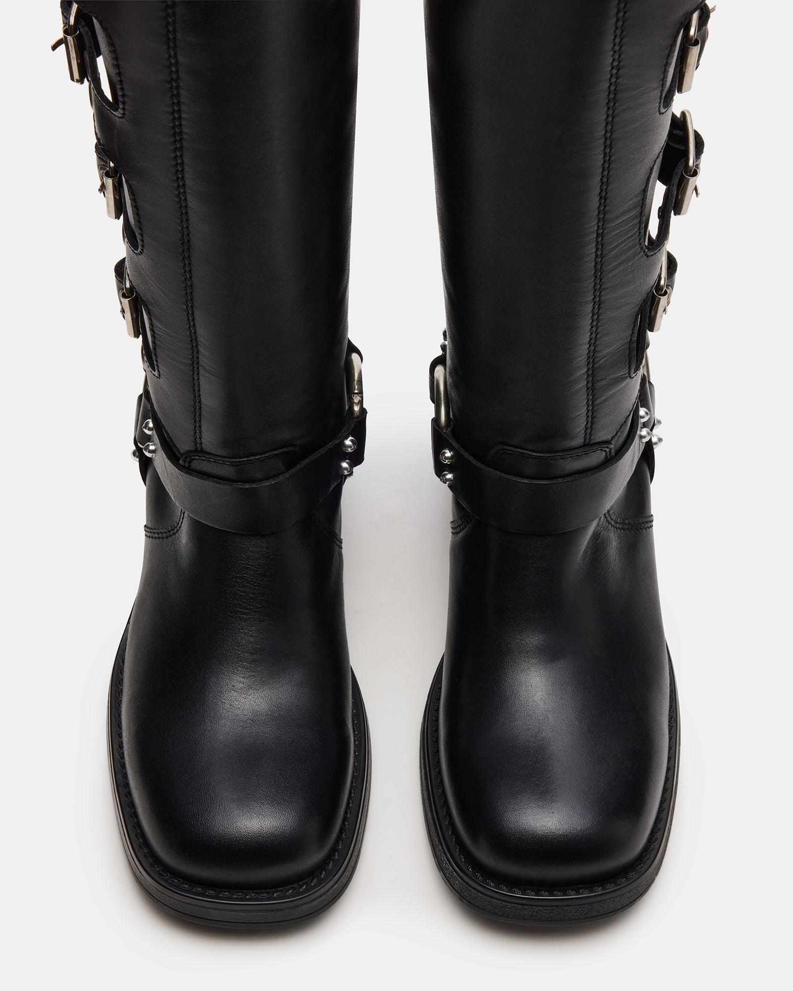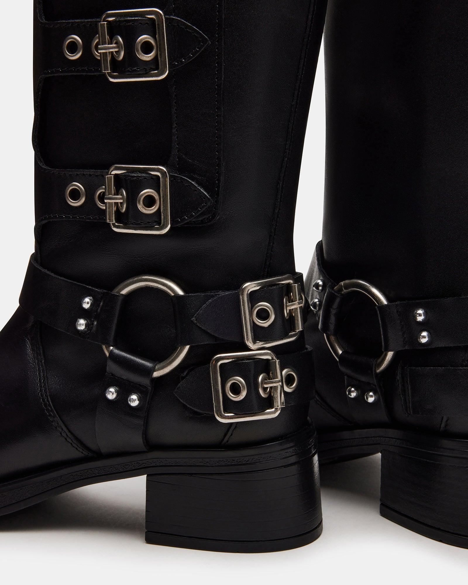 The ROCKY knee boot features the wide profile of an engineer boot with harness and buckle hardware adding an industrial edge and giving the design an adjustable fit. Block heel engineer boot Slip-on style Top gore with 4 adjustable buckle straps 2 inch heel height Size 6 measurements: 14.5 inch shaft circumference, 12.5 inch shaft height Size 8 measurements: 15 inch shaft circumference, 13 inch shaft height Size 10 measurements: 16 inch shaft circumference, 13.5 inch shaft height Leather upper material Synthetic lining Synthetic sock Synthetic sole This product is made with premium leather and is individually hand finished. As a result, the product can vary slightly from the pictures. Fit tip: If you are in between sizes, size up a half-size Imported