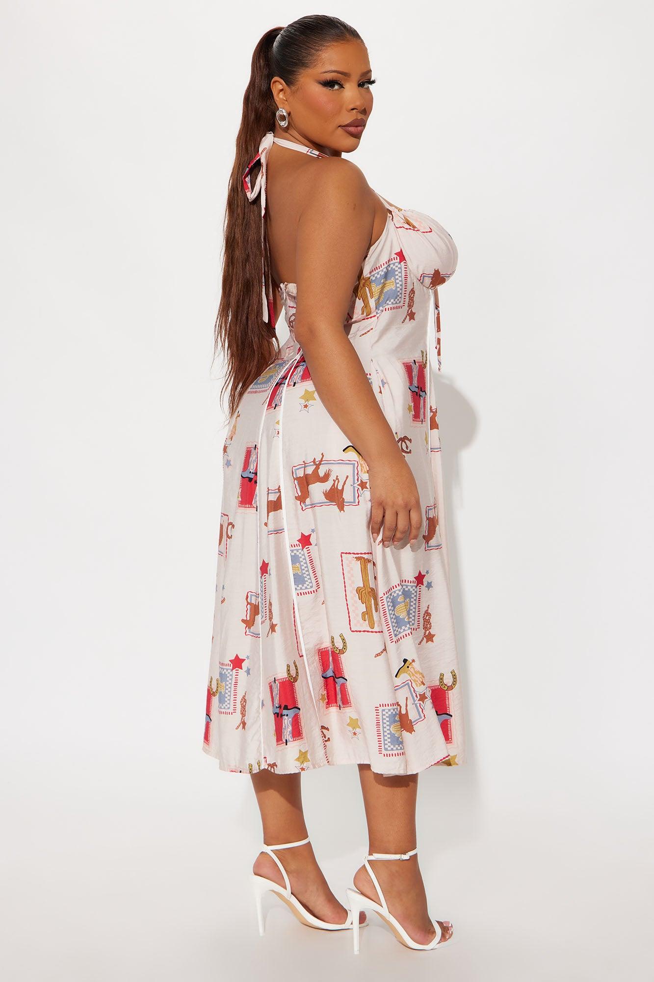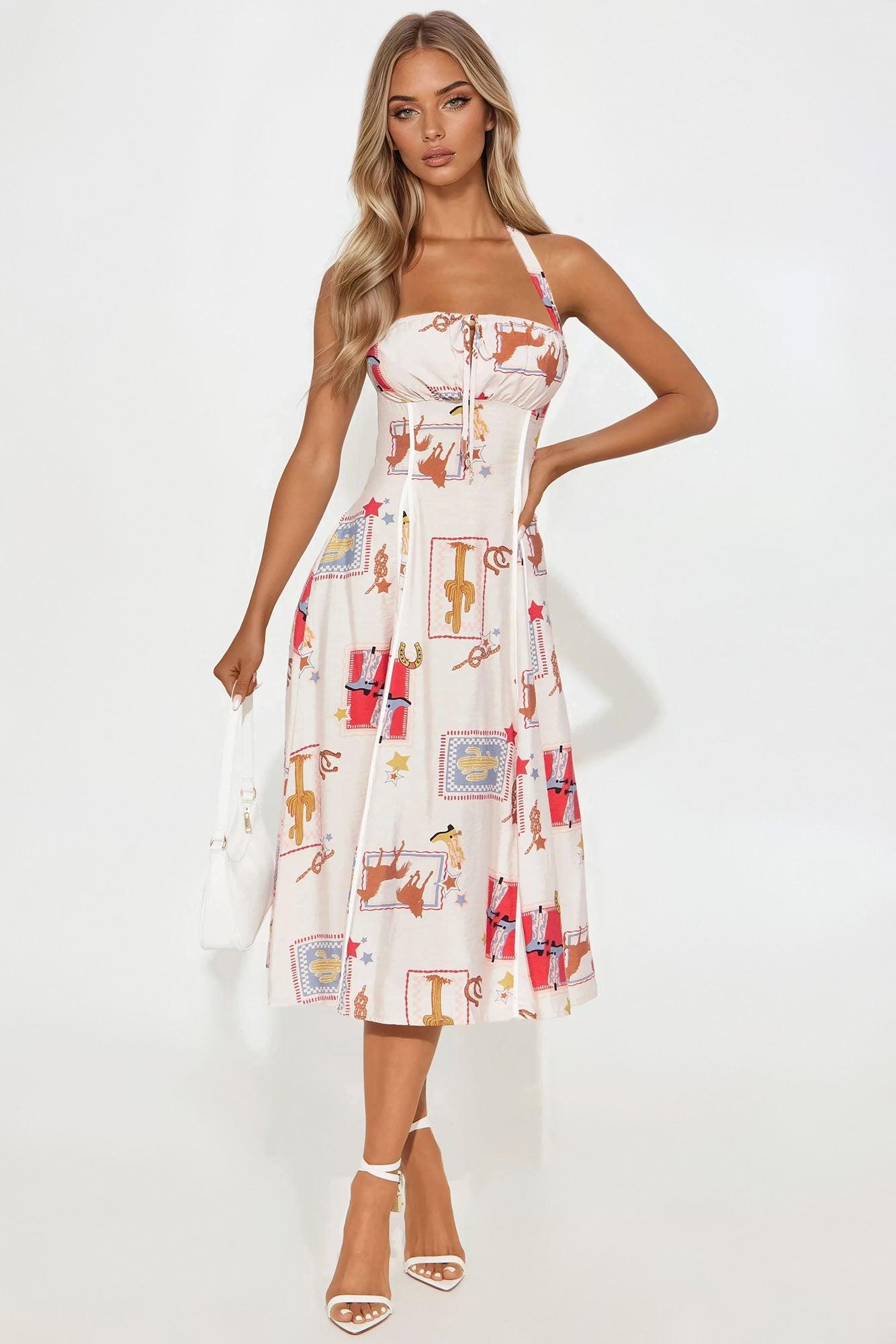 Available In Beige/Brown. Midi Dress Square Neckline Halter Tie Front Back Zipper Stretch Length Measured Flat = 45" Disclaimer: Due To The Printing Process A Difference In Saturation May Occur. Each Garment Is Unique. Print Placement Will Vary. Self: 83% Rayon 17% Nylon Contrast & Lining: 100% Polyester Imported