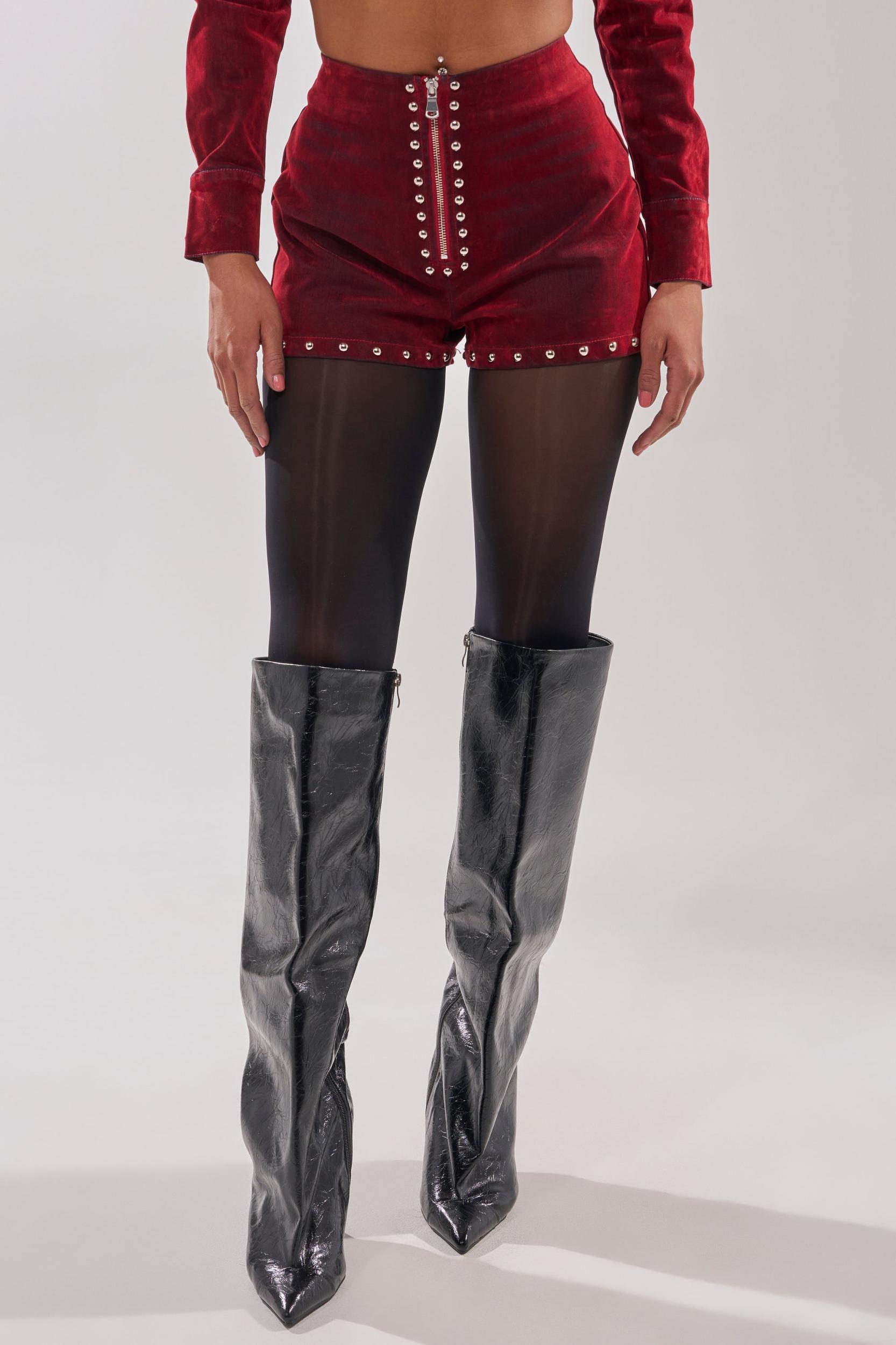 Lasso looks in the AKIRA Label Rodeo Vibes Velvet Denim Studded Short! These bold red velvet high-waisted shorts feature a luxe, soft-touch finish accented with metal stud detailing along the front zipper panel and hem for an edgy, fashion-forward look. Designed to hug curves with a structured fit and flattering darts, these shorts are sure to grab attention and look amazing! Pair with the coordinating AKIRA Label Rodeo Vibes Velvet Denim Zip Up for a cute matching look. - 70% Cotton 28% Polyester 2% Spandex- Slight Stretch- Imported (all measurements are approximate from size small)- 12” Waist to Hem- Model is 5’9” and wearing size smallProduct ID: 1071916 (all measurements are approximate from size 1X)- 14” Waist to HemProduct ID: 1071920