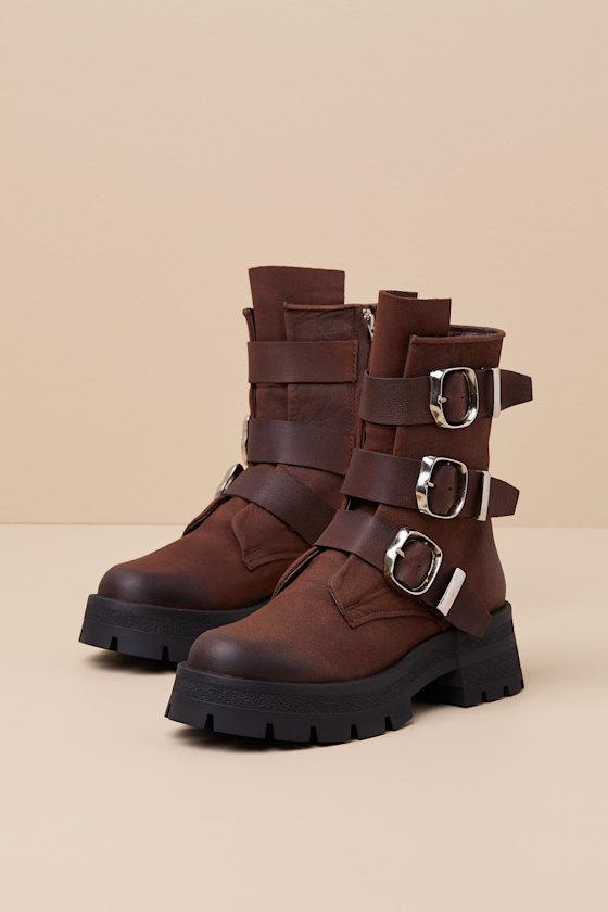 Lead the trend of stomp-worthy style with the Steve Madden Roland Brown Leather Buckle Moto Ankle Boots! Textured genuine leather (with subtle fading throughout) shapes a rounded upper and an ankle-high shaft with three, wide straps at the vamp that secure with oversized, silver buckles (featuring an organic-like design). A 6.5" zipper at the instep makes for easy on-and-off, while a chunky lug heel completes the Moto-inspired look!