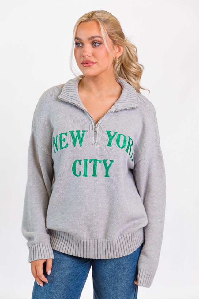 Details Grey and Green New York Embroidered Quarter Zip Sweater Fabric has stretch Ribbed hem, quarter zip, embroidered New York script Pair this quarter zip with cute pair of jeans! Unlined Size small from shoulder to hem: 22" Material and Care 50% viscose 30% polyester 20% nylon Machine wash cold, tumble dry low Patterns may vary Materials may have natural variations Colors may vary from different viewing devices.