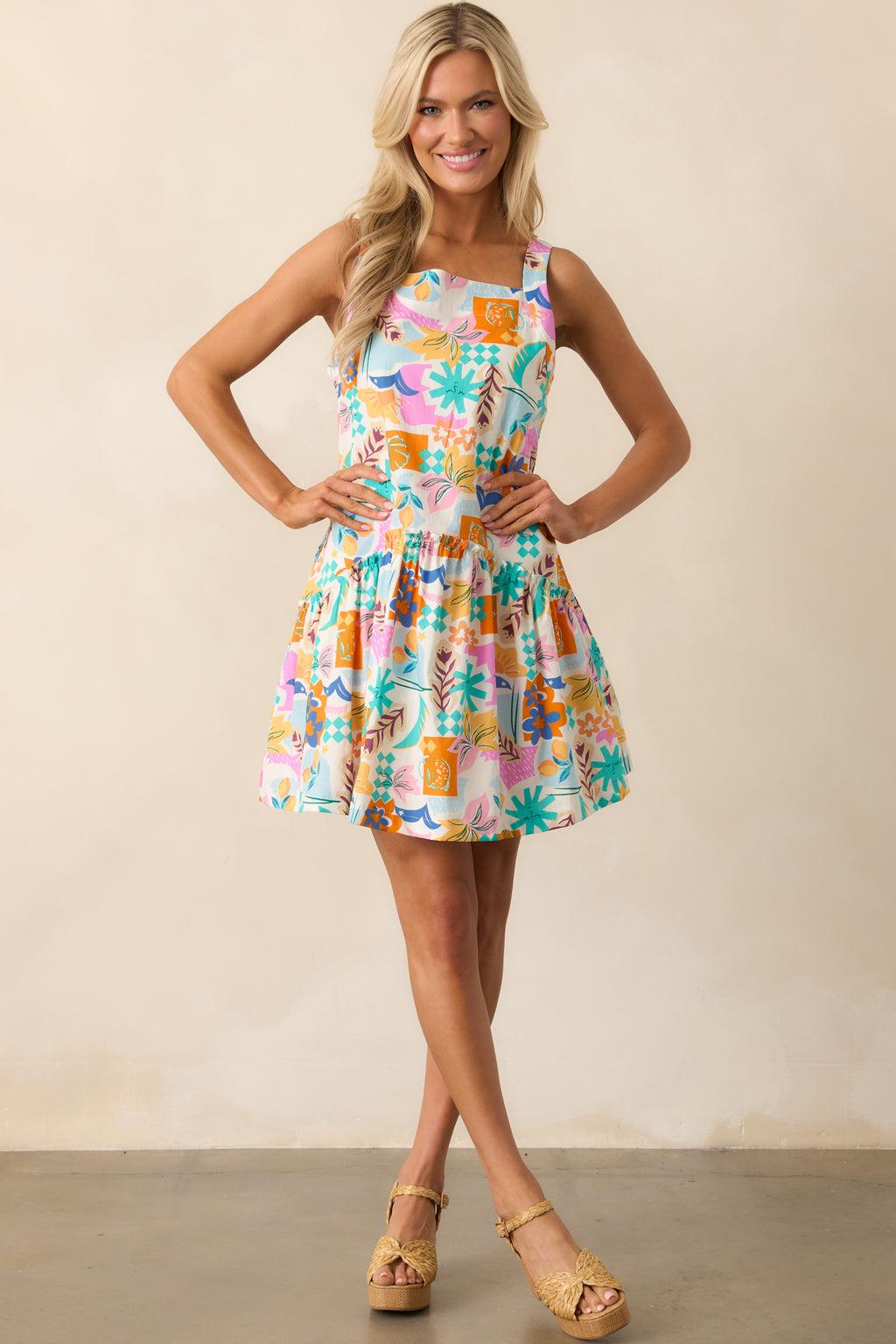 The Roll With It Pink Tropical Print Cotton Drop Waist Mini Dress is all about embracing the carefree spirit of adventure. It's perfect for those moments when you want to let go and enjoy the ride, with a playful vibe that captures the essence of spontaneity. This pink dress features a multicolor tropical print, a high square neckline, back keyhole closure, drop waist design, ruffle detailing, and functional pockets.