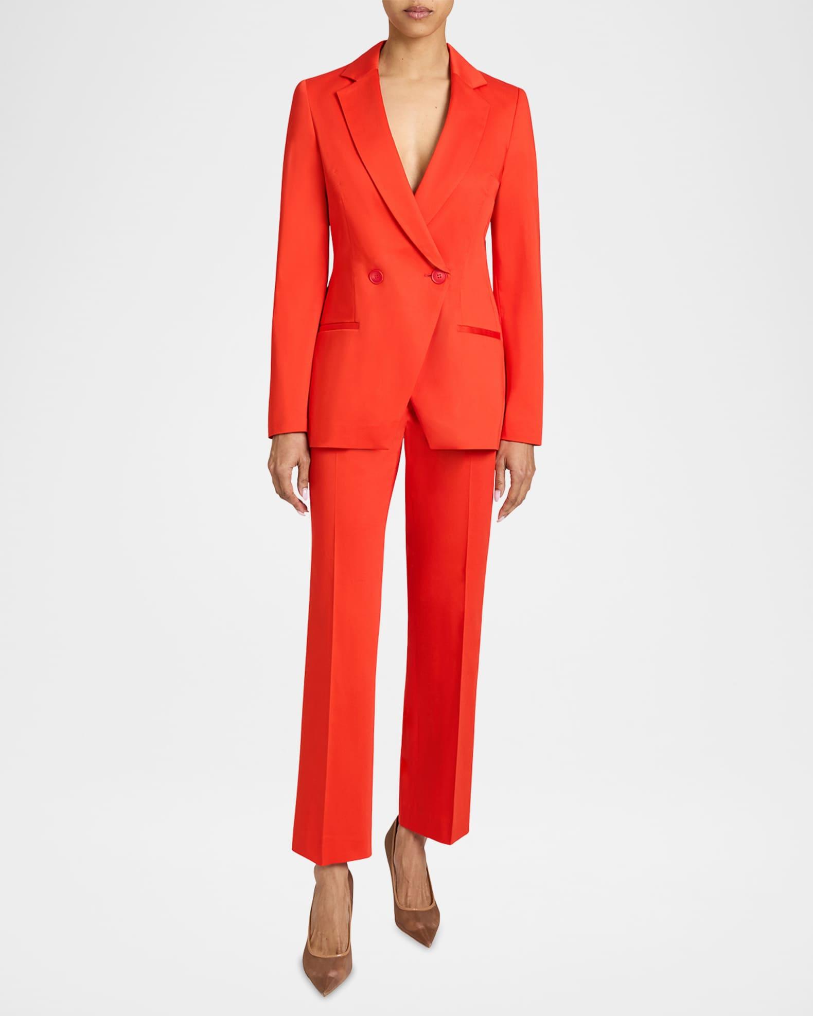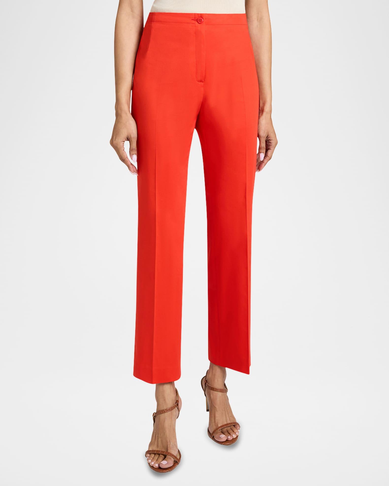 Santorelli "Roma" pants constructed in a subtly shiny stretch cotton Approx. measurements: 10.5" rise; 28" inseam Mid-rise sits high on the hips Flat front Cropped at the ankle Straight legs Button/zip fly Cotton/elastane Unlined Dry clean Made in Italy