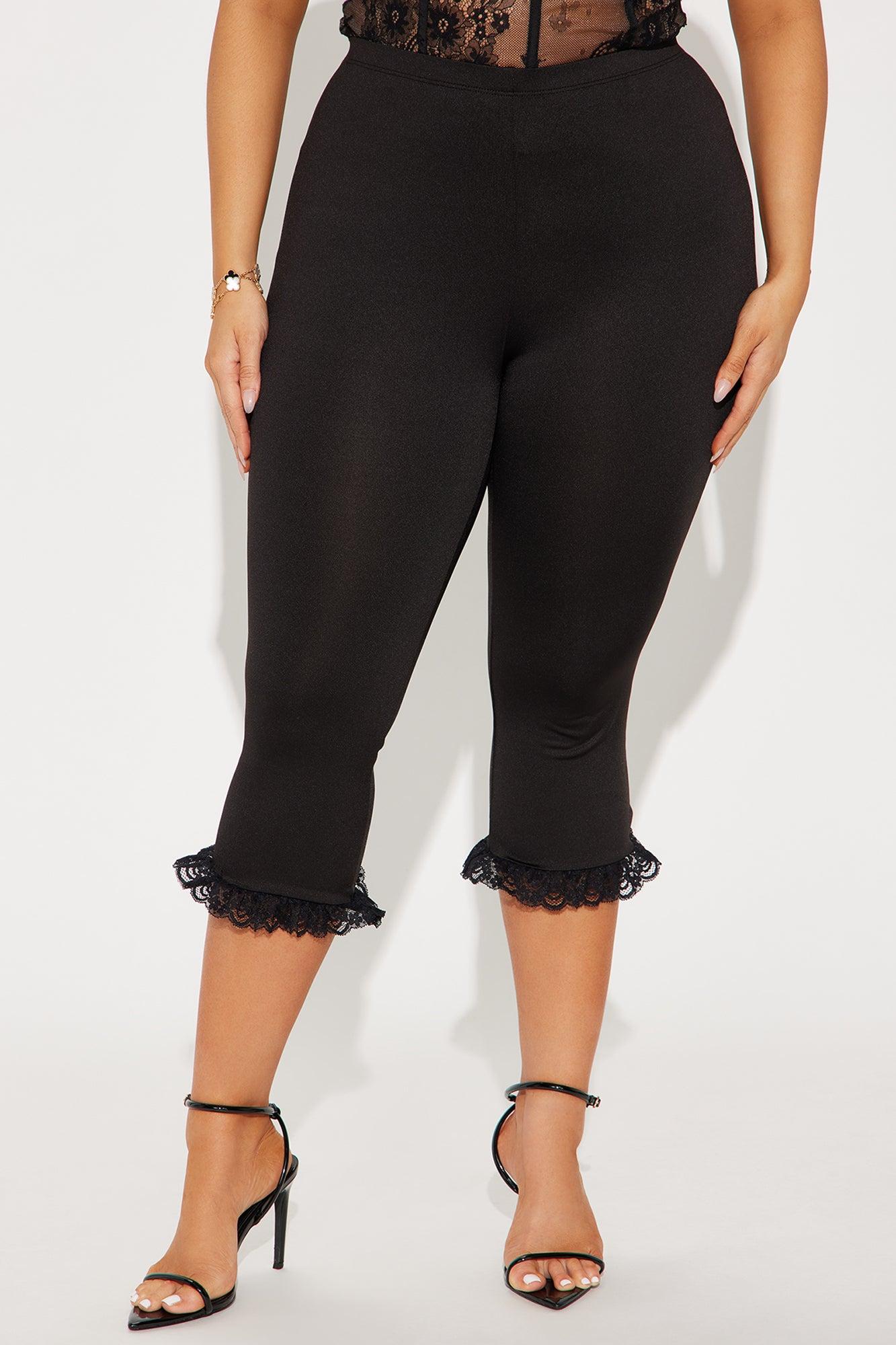 Available In Black. Capri Legging Mid Rise Elastic Waistband Ruffle Lace Trim Stretch 80% Polyester 20% Spandex Imported