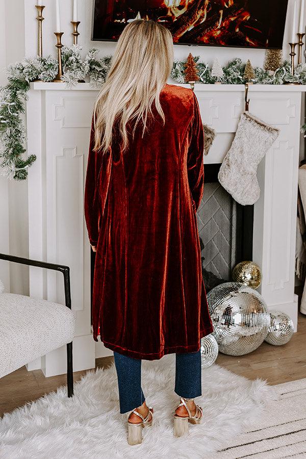 - You are guaranteed to turn heads when you arrive in this elegant coat! - Soft fully lined velvet material - Long loose sleeves - A collared neckline - Low accent pockets - A draped open front silhouette that cascades into a straight mid-calf length hemline Measurements XS : Bust 34", Hip 36", Length 42.5", Sleeve Length 24", Waist 32". S : Bust 36", Hip 38", Length 42.5", Sleeve Length 24", Waist 34". M : Bust 38", Hip 40", Length 43", Sleeve Length 24.5", Waist 36". L : Bust 40", Hip 42", Length 43", Sleeve Length 24.5", Waist 38".