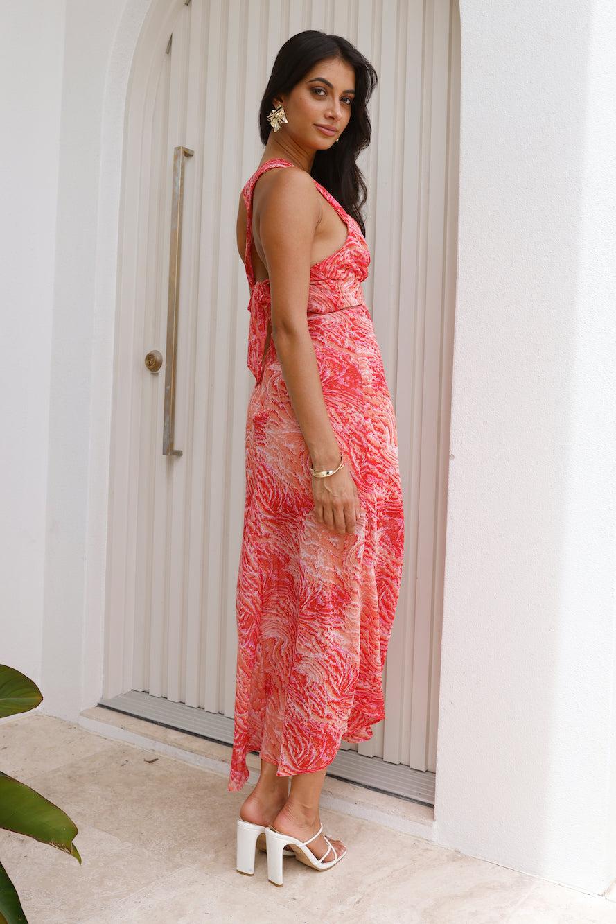 Length from shoulder to hem of size S: 138cm. Chest 28cm, Waist 29cm, across front only of size S. Maxi dress. Semi-lined. Model is a standard XS and is wearing size XS. True to size. Non-stretch. V-neck. Flowy skirt. Tie-up. Cutouts. Zipper. Cold hand wash only. Print placement may vary. Polyester. Enter your romantic era with the Romance Beachside Maxi Dress. Featuring a tie-up back design with cutouts on the waist. Style with heels or sandals for a 'fit we love.
