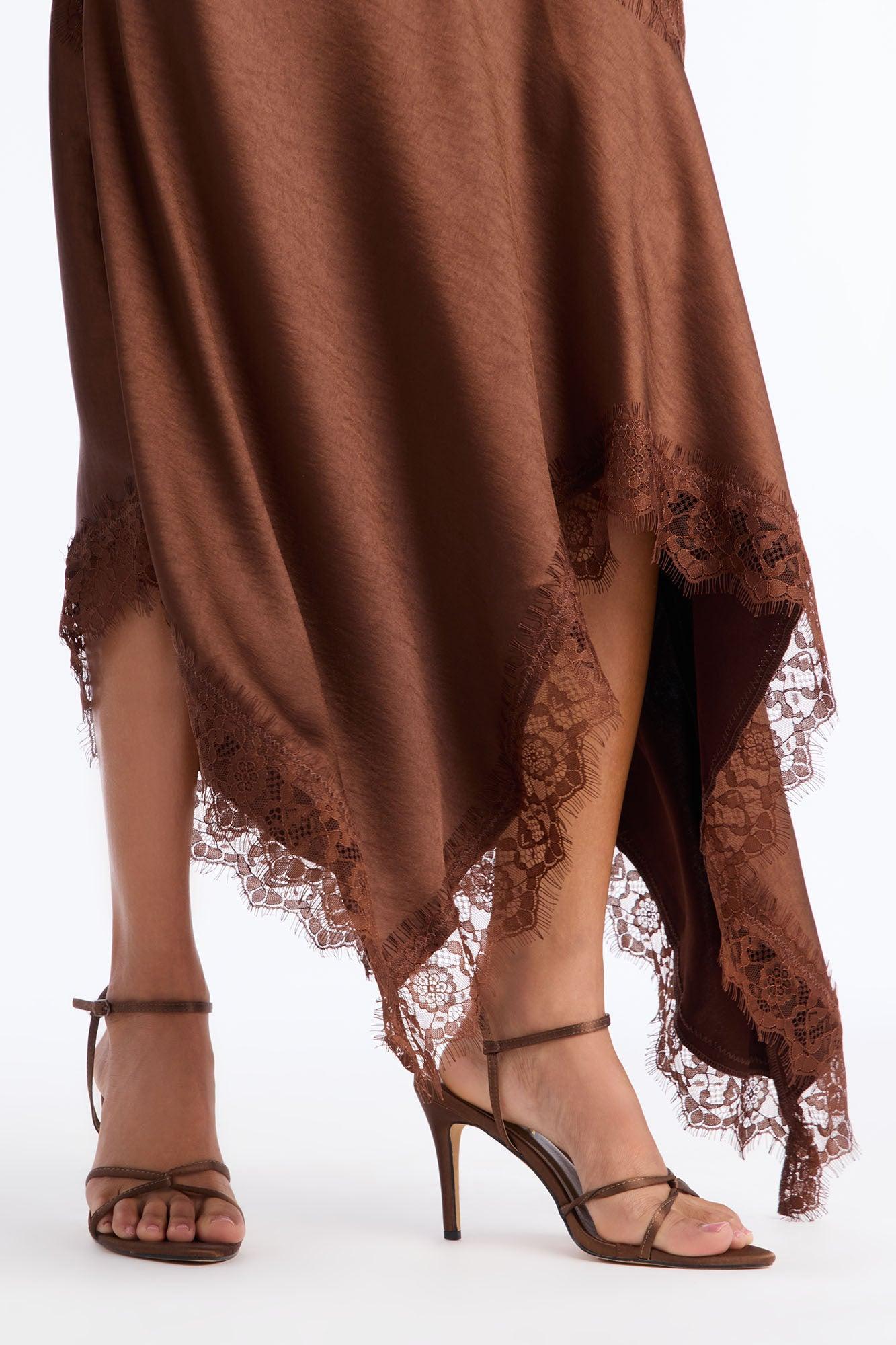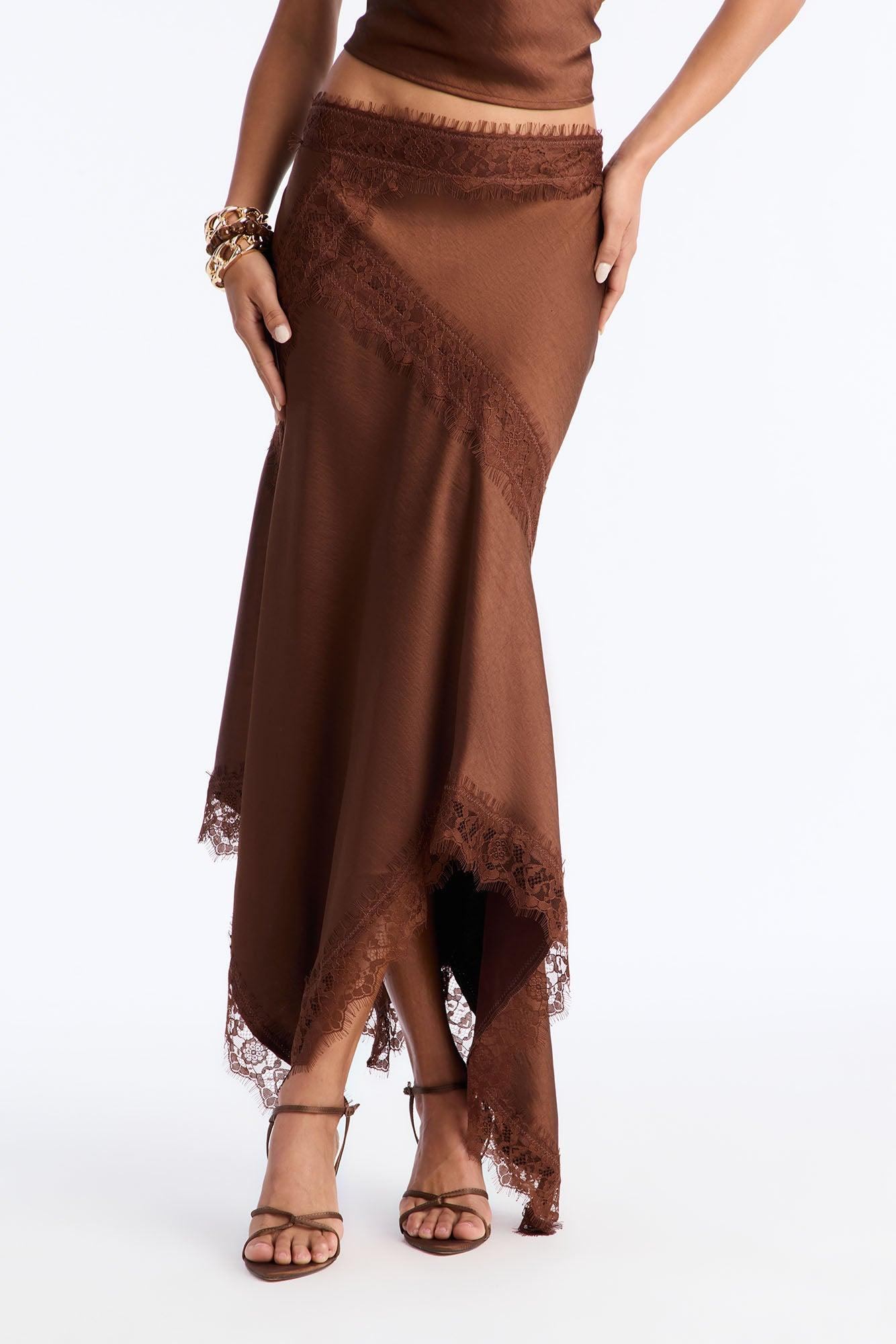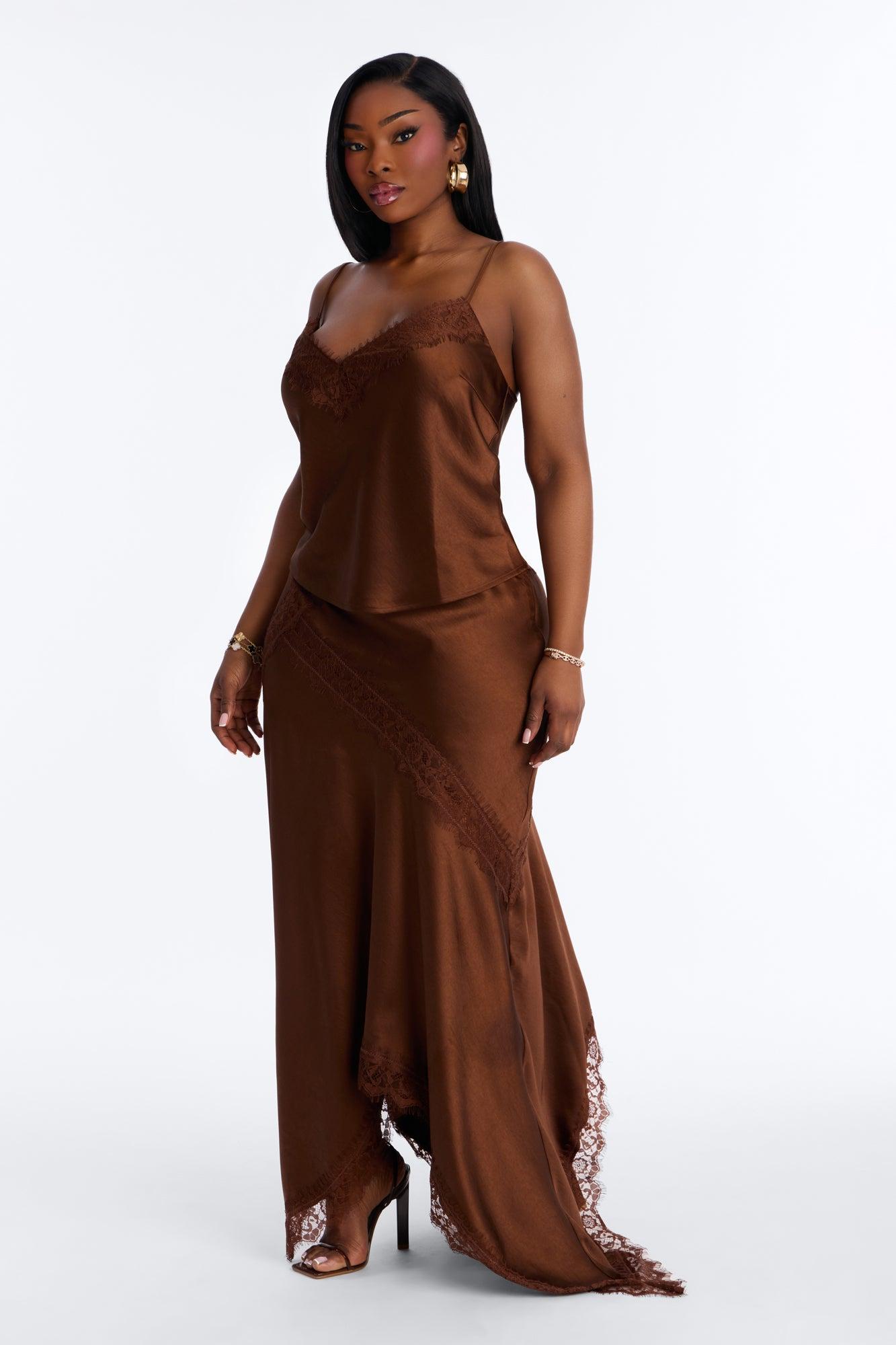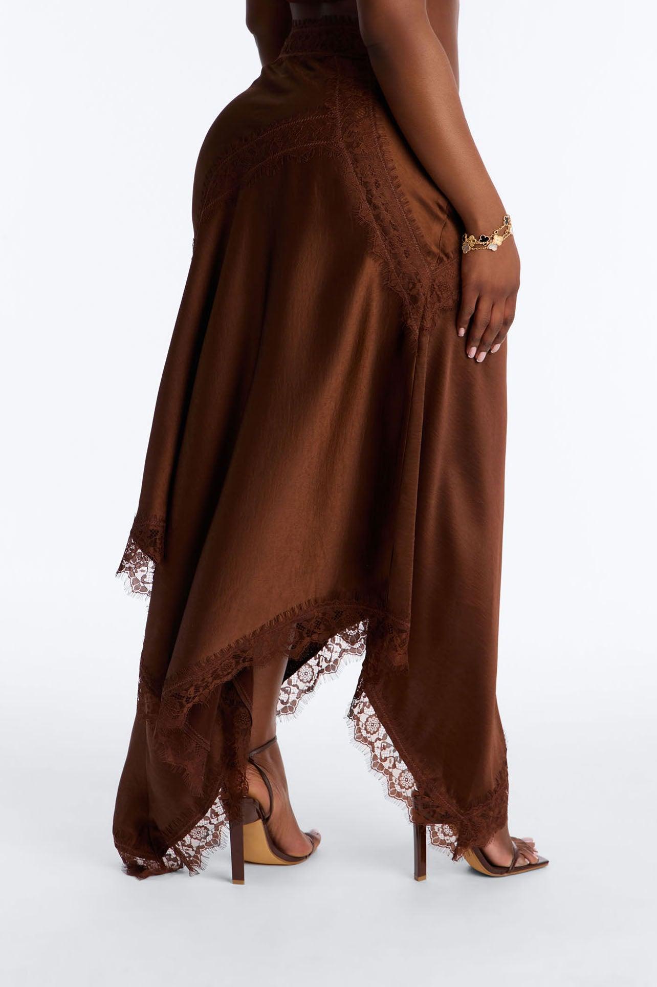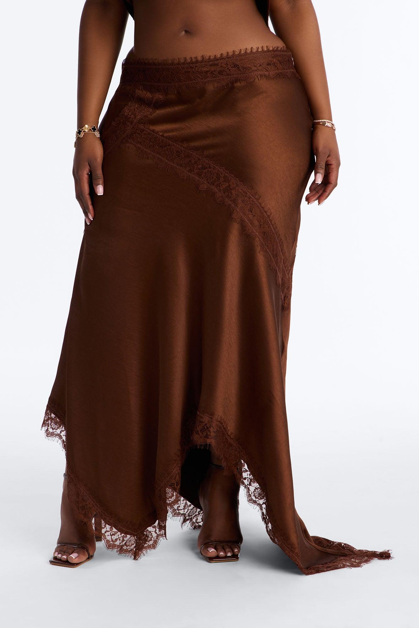 Available In Brown And Off White. Satin Midi Skirt Lace Trim Pair With "Romance Me Satin Lace Trim Cami Top", "Romance Me Satin Trench Coat" Side Zipper Self: 96% Polyester 4% Spandex Contrast: 100% Nylon Imported California Proposition 65WARNING: Cancer and Reproductive Harm - www.P65Warnings.ca.gov.