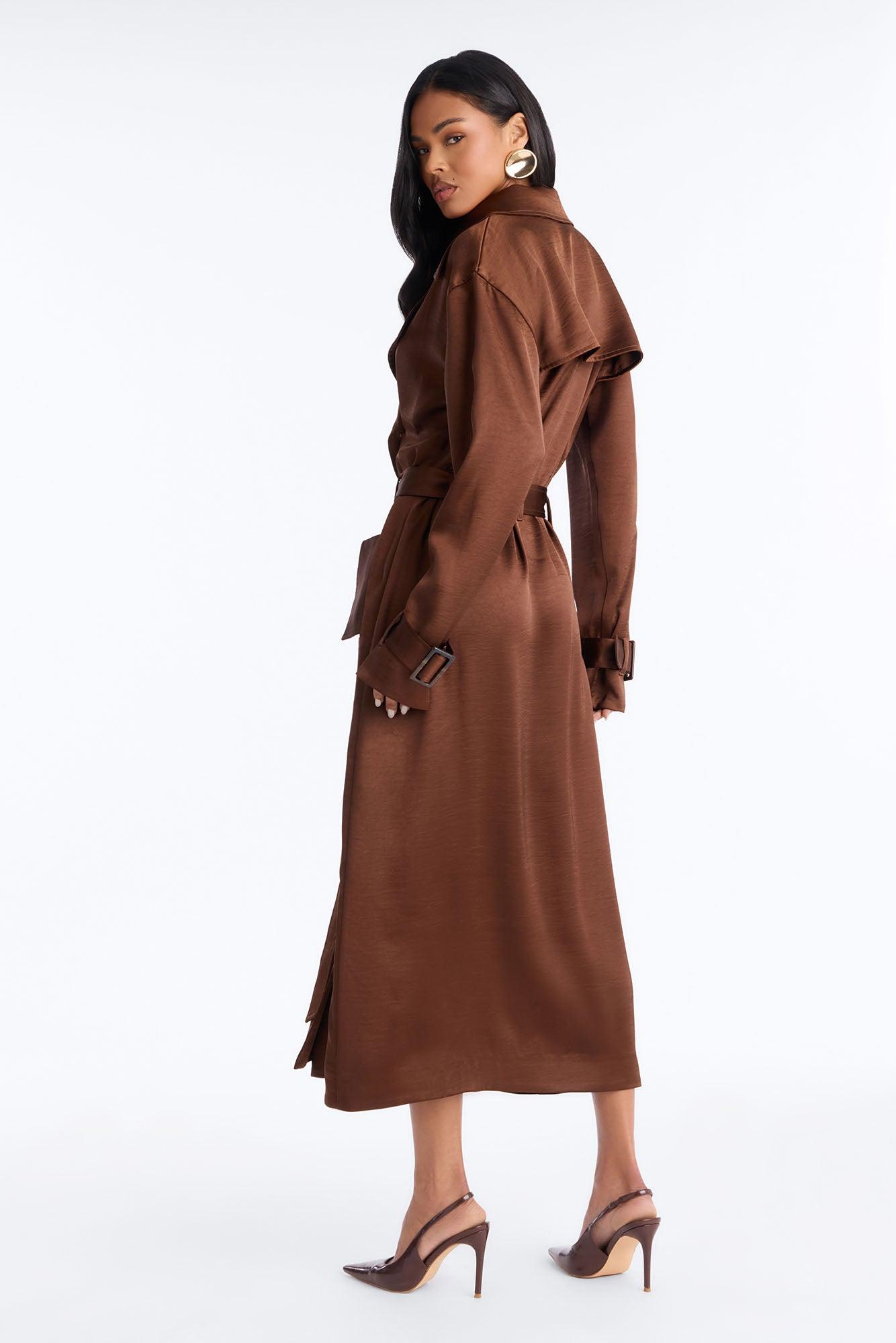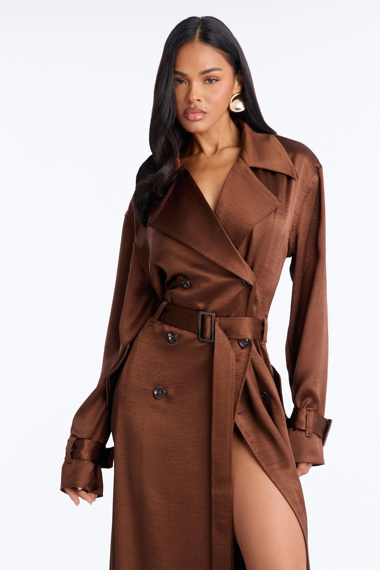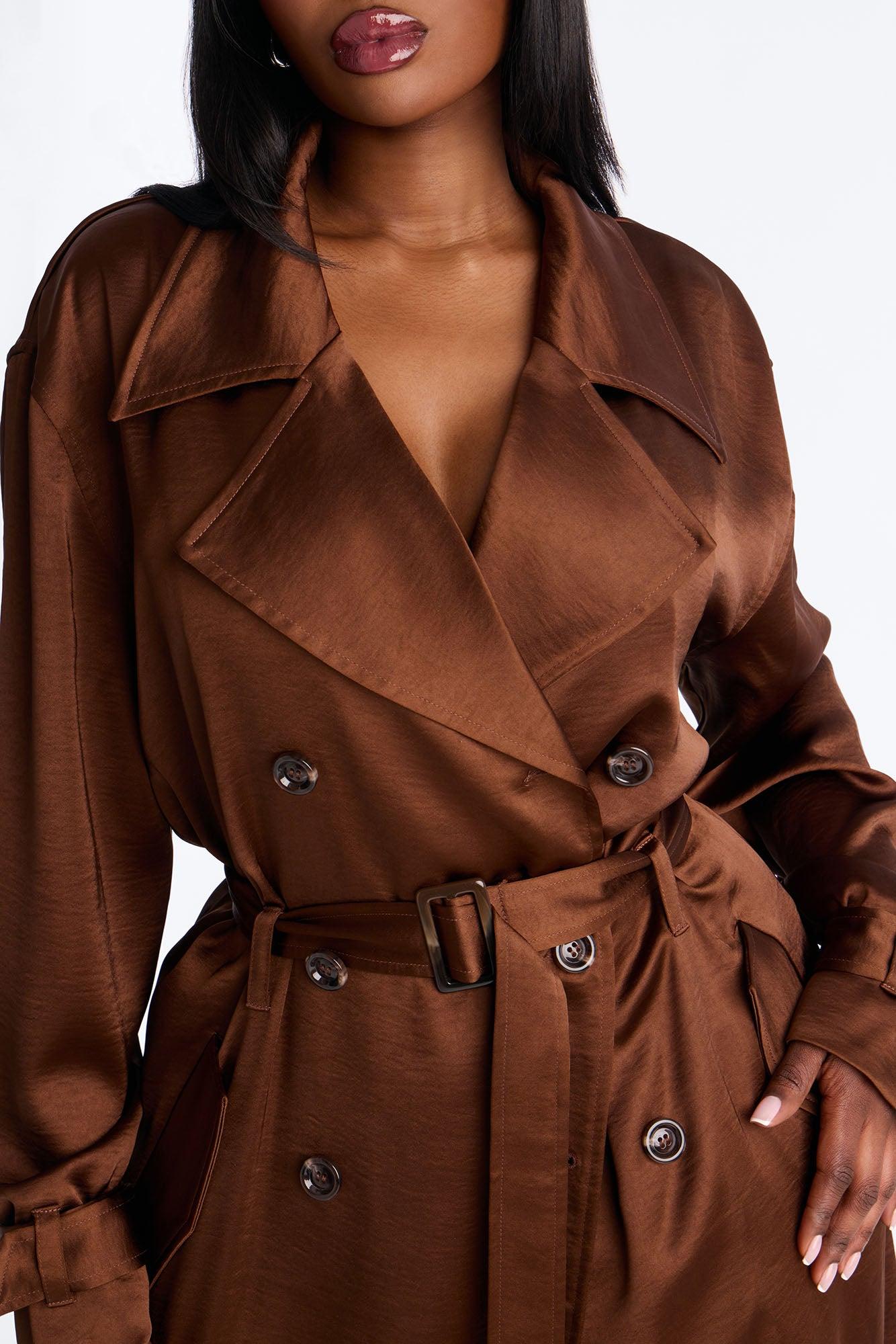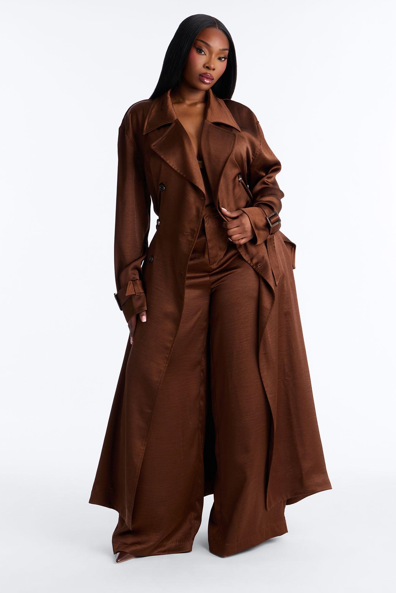 Available In Brown And Off White. Hammered Satin Trench Coat Belted Pair With "Romance Me Satin Trouser" and "Romance Me Satin Lace Trim Cami Top" Self: 96% Polyester 4% Spandex Lining: 96% Polyester 4% Spandex Imported California Proposition 65WARNING: Cancer and Reproductive Harm - www.P65Warnings.ca.gov.