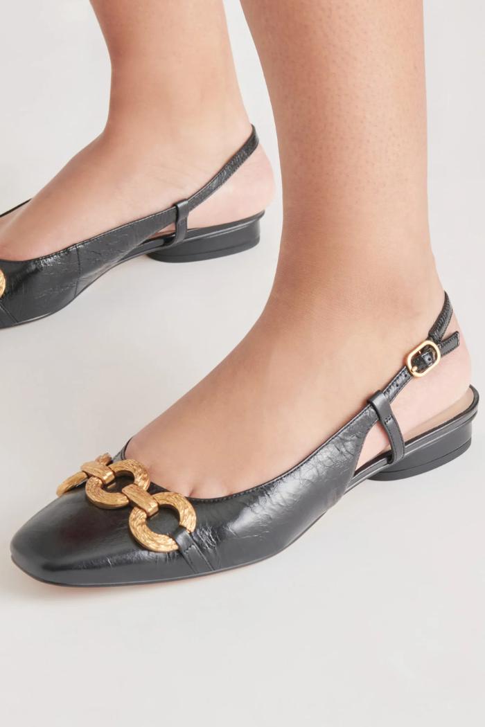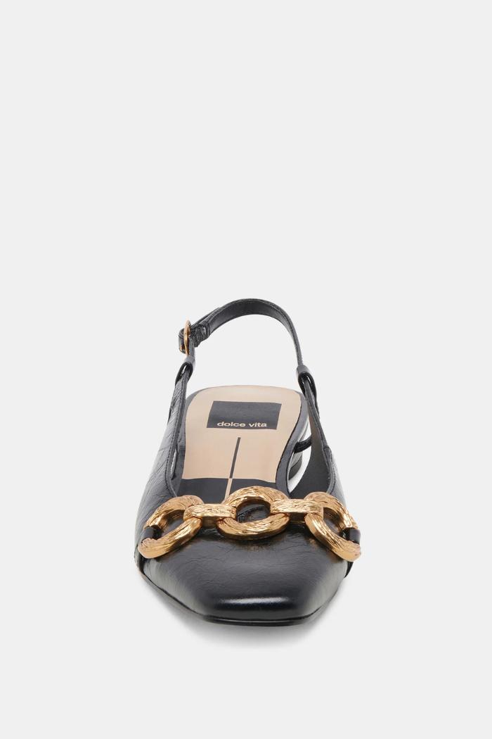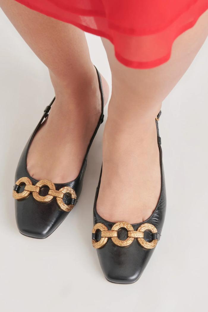 RAMANO will make them think you inherited a killer vintage pair of shoes. This slingback flat features a barely-there block heel and chunky gold chain. She plays well with everything from mini skirts to jeans and a cardigan.