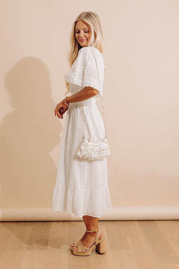 - Super sweet and oh so charming, this darling midi will keep you looking gorgeous! With its eyelet material and flattering smocked waistline, this dress is sure to captivate. - Fully lined eyelet material - A v-cut neckline - A v-cut back with a tie detail - Short butterfly sleeves with scalloped detailing - A smocked waistline - A flowy and flattering silhouette that ends in a ruffled, midi length hemline