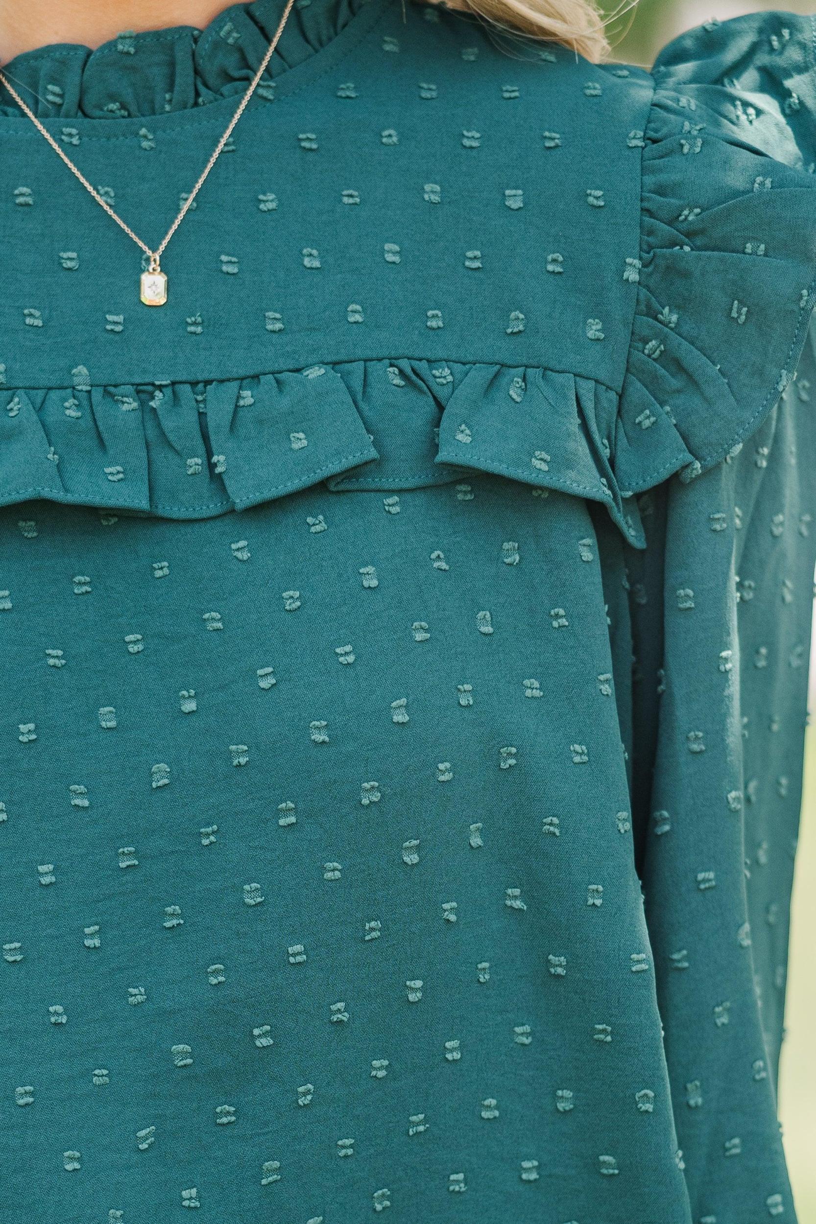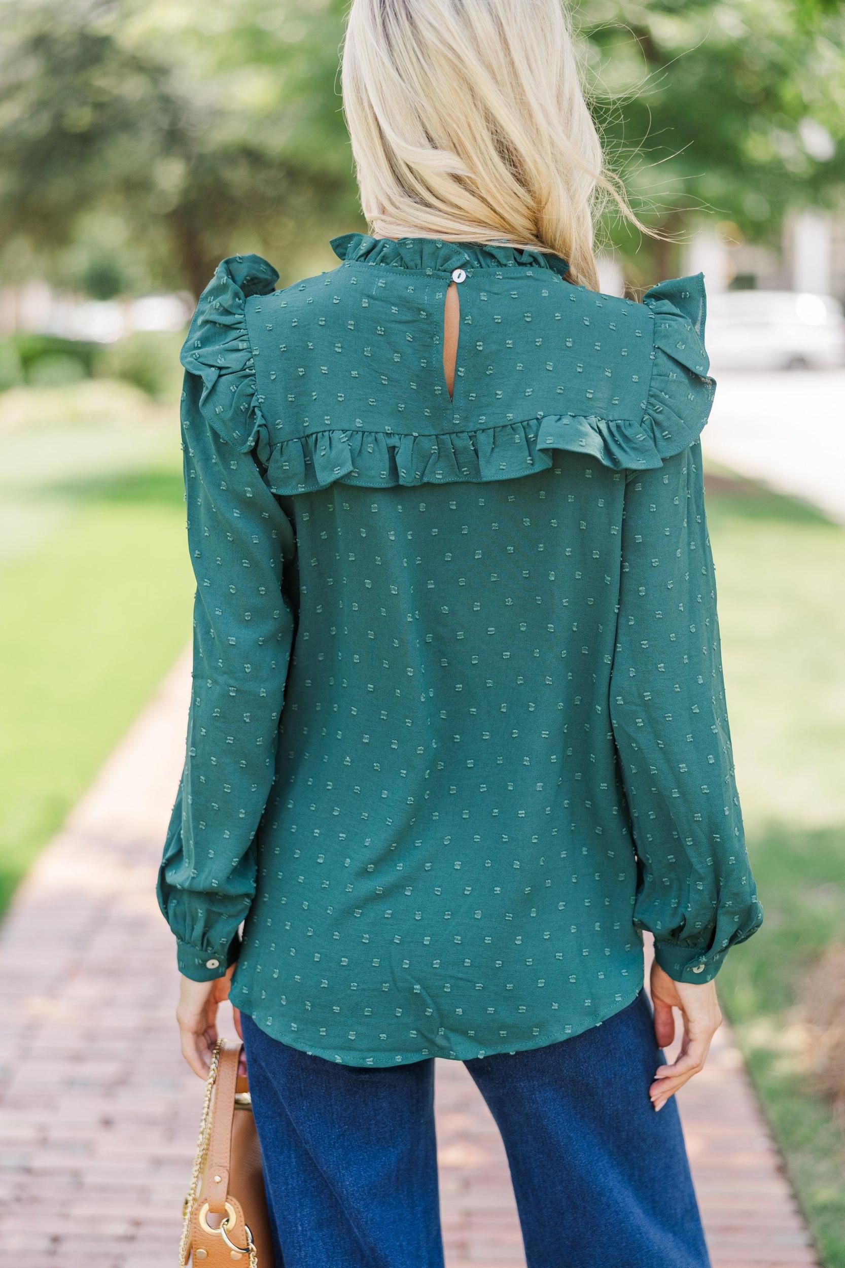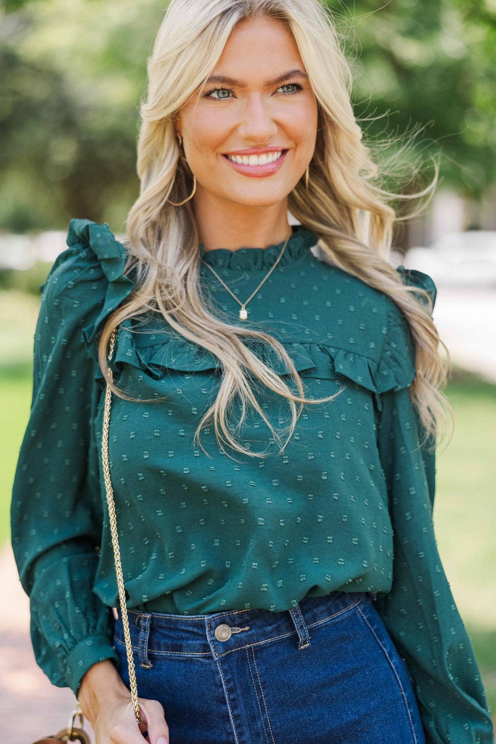 You and this blouse are going to create a beautiful romantic history together! The ruffles are just so cute and we are obsessing over the textured detailing! This blouse is going to look fabulous with nice pants or a skirt! Round neckline Button keyhole back Long sleeves Ruffled and textured detailing Minimal stretch Baileigh is wearing the small.