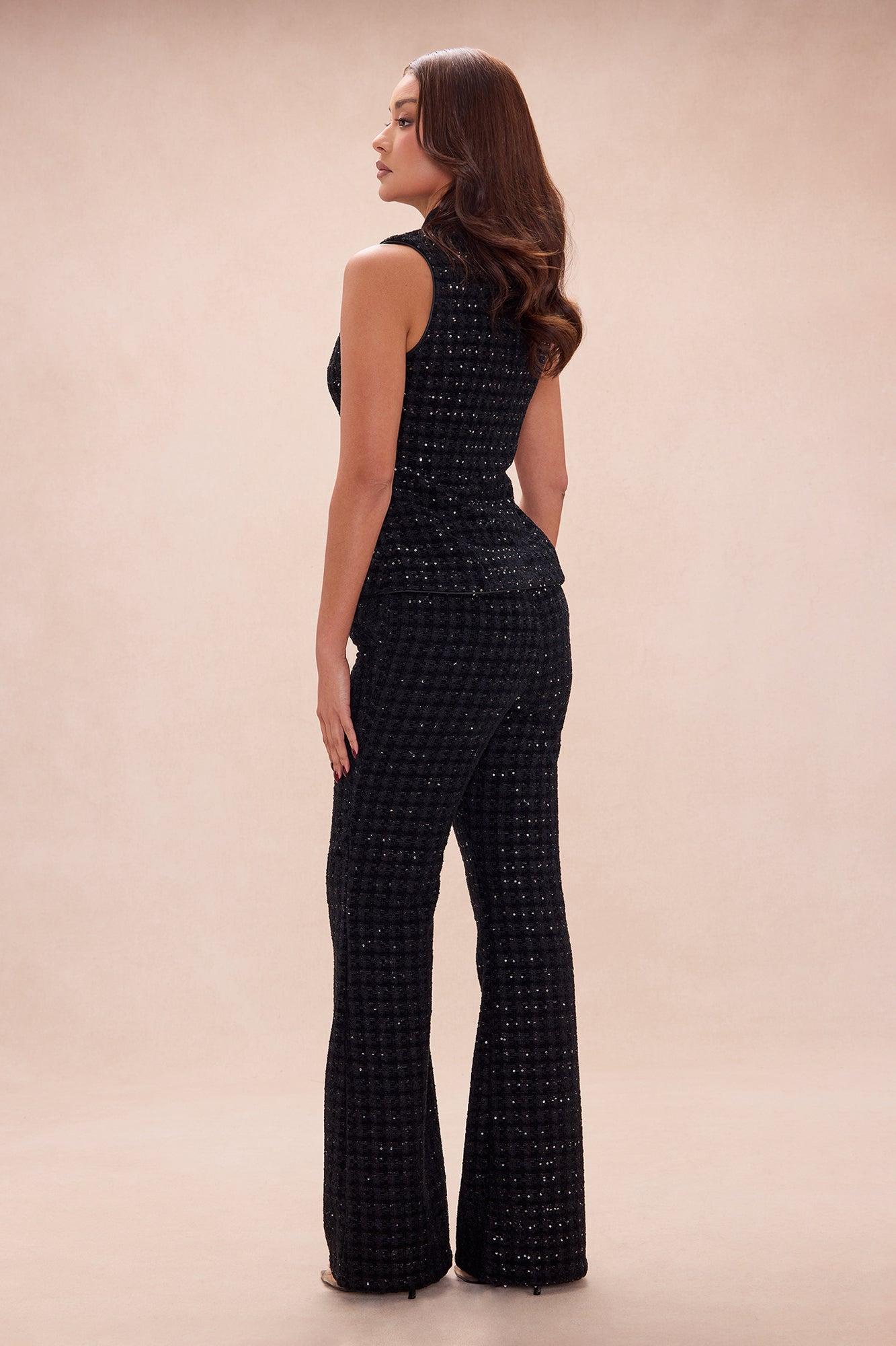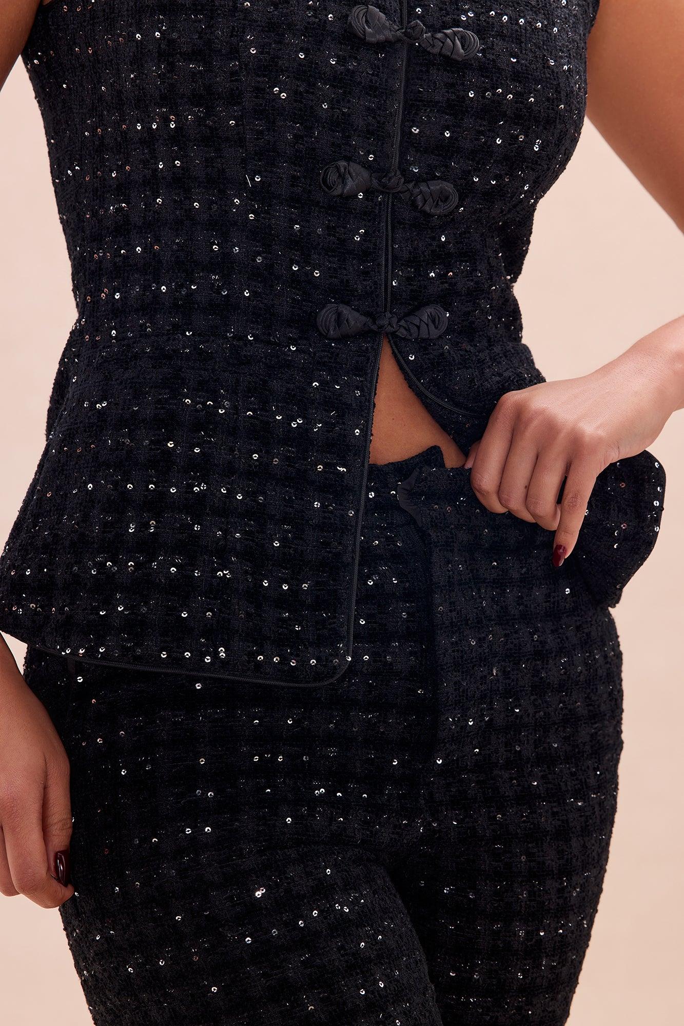 Available In Black. Embellished Tweed Pant Ensemble Vest Top Sleeveless Collared Faux Pockets, Front Frog Closure Lined Non Stretch Flare Pant Belt LoopsPockets Front Hook And Zipper Closure Non Stretch Shell: 10% Wool 90% Polyester Lining: 100% Polyester