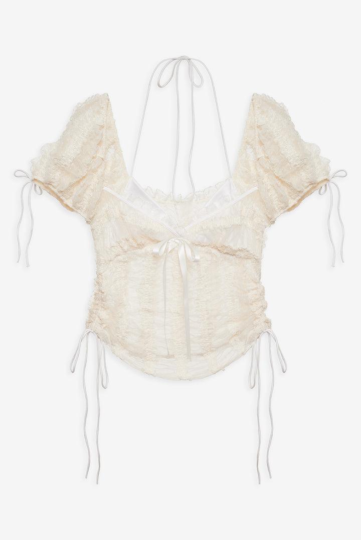 Get into the festival spirit with the Romy sheer blouse–a ruffled crop top with an exposed triangle cup lining and halter tying straps. Designed for slow desert days, this puff sleeve top is adorned with intricate lace trims and decorative bows throughout.