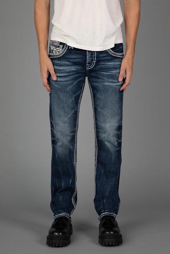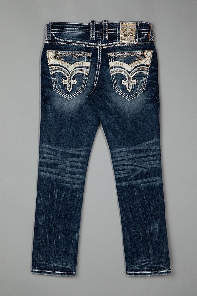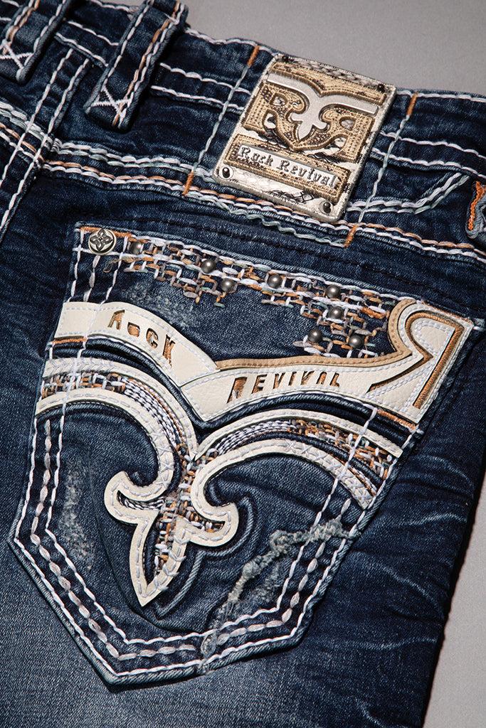 Stylish pewter white brushed hardware throughout. Light whiskering on front legs with inverted Fleur de Lis back pockets. White leather "R" on each pocket and snake print leather belt loop patch. Designed with care and creativity in Los Angeles, California.