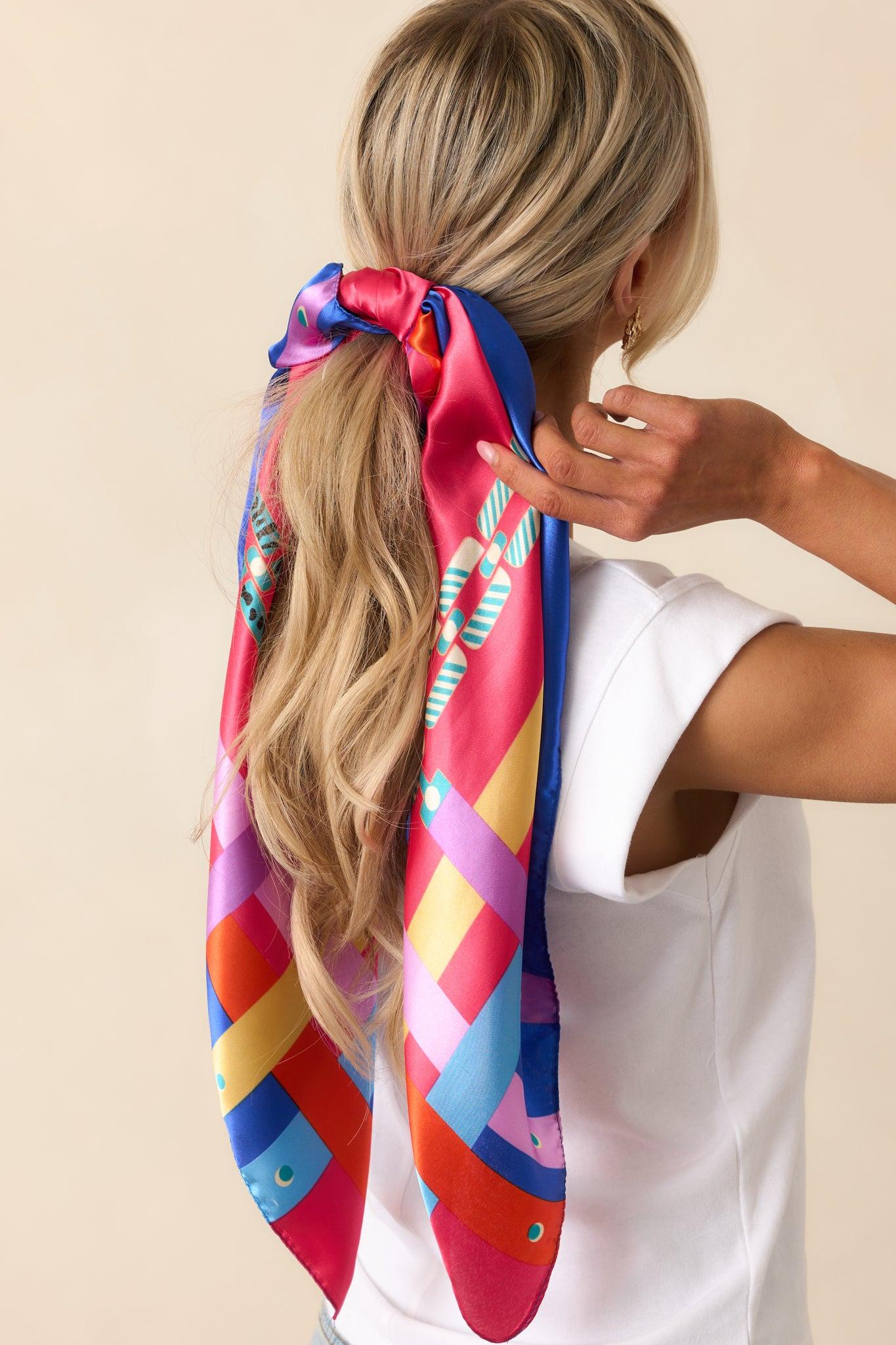 Elevate your style with our Rooftop Sunsets Satin Scarf! The bold fuchsia multi print adds a pop of color to any outfit while the lightweight and smooth satin material drapes elegantly. Stay chic and comfortable all day long. This pink multi print scarf features a satin material, a pink & multi color print chain design, and purple, orange, yellow, teal, & blue accent colors on the corners & sides. Scarf Measures: 36" x 36" 100% Polyester Imported