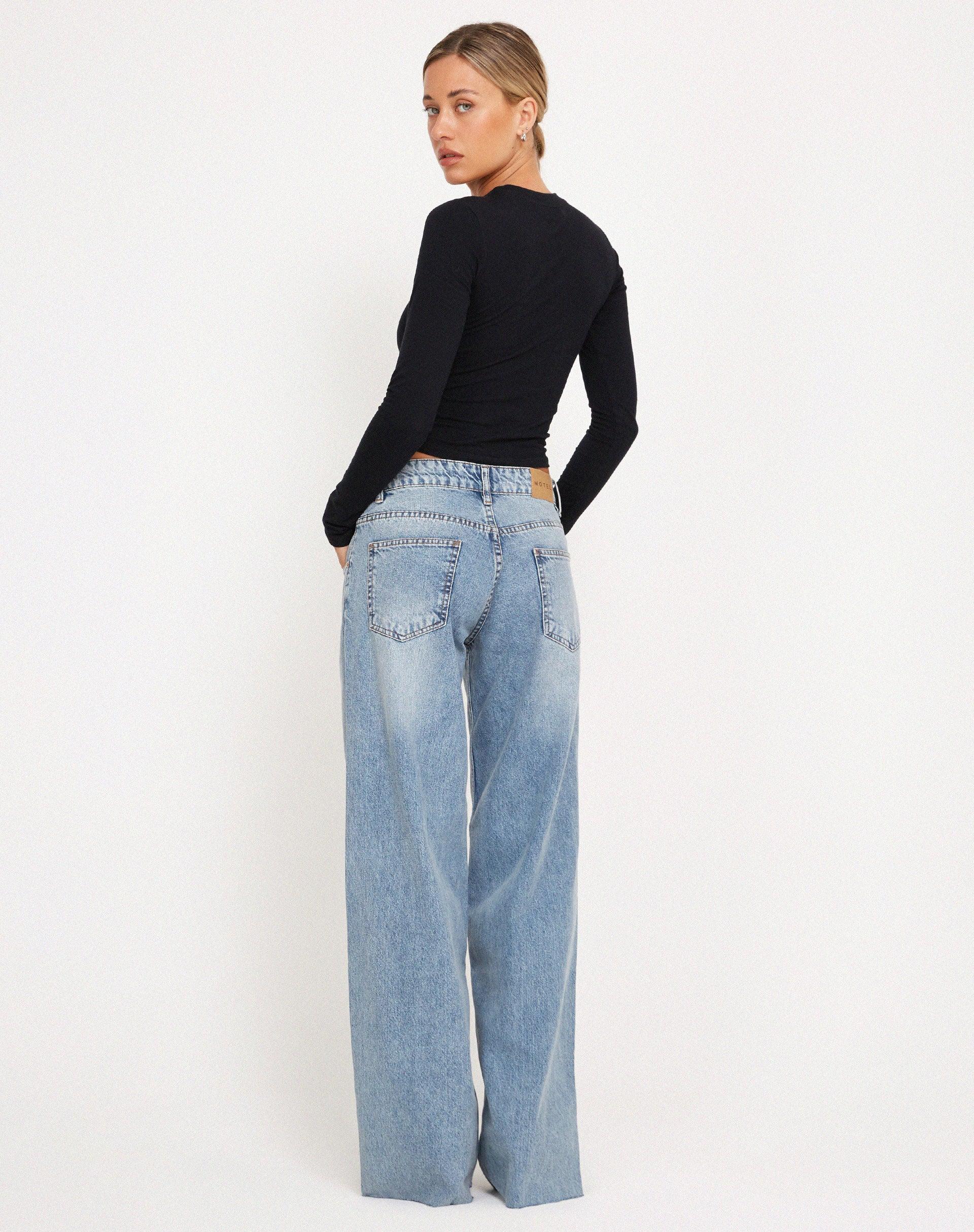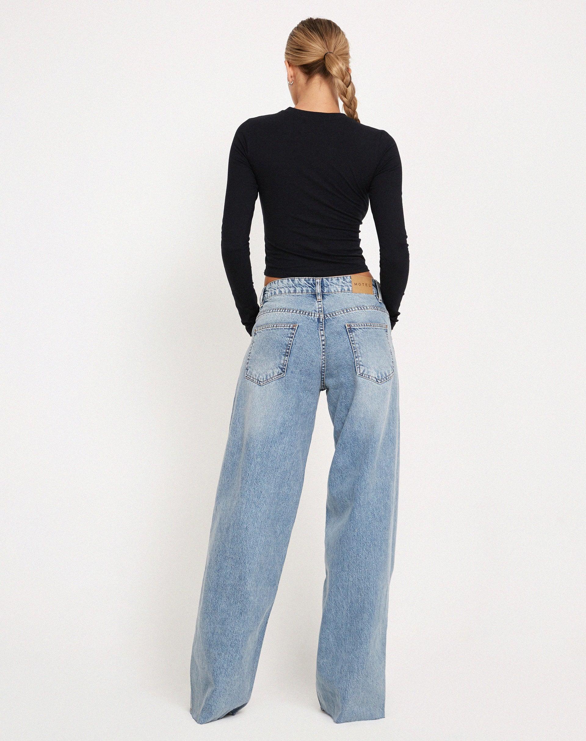 Our classic Roomy jean with a twist. Featuring a floor length, wide leg design with a raw hem, low rise oversized fit, pocket detailing and branded back tab, buttons and rivets, in a vintage blue wash rigid denim. NOW AVAILABLE IN TWO LEG LENGTHS MODEL WEARS SIZE: SMALL - MODEL HEIGHT:5'8