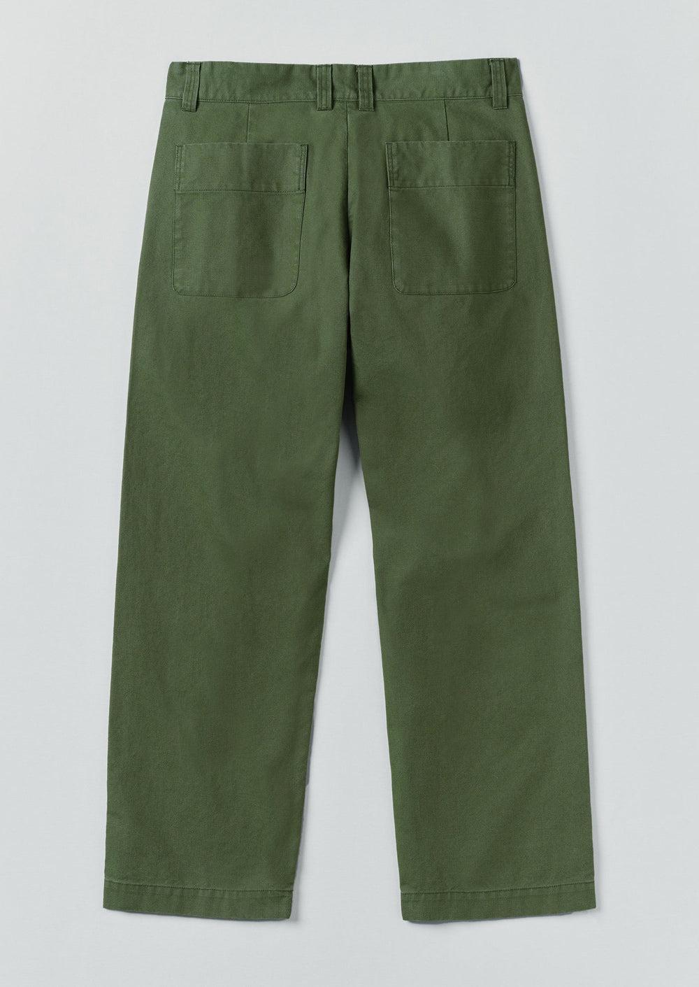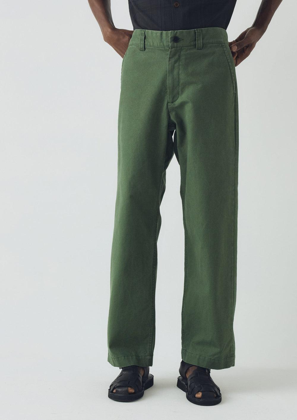 Cotton canvas. Piece-dyed. Straight legs. Slanted side pockets. Back patch pockets. Front horn button and zip.