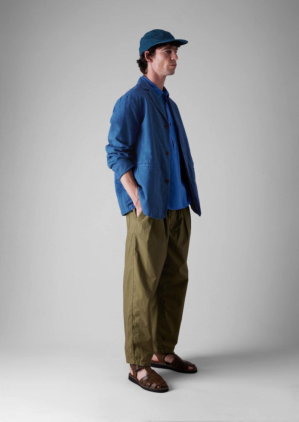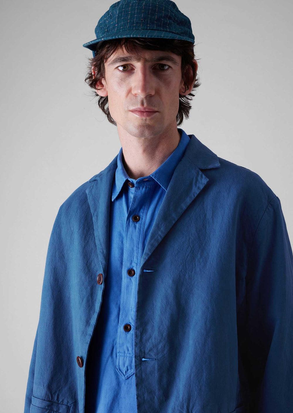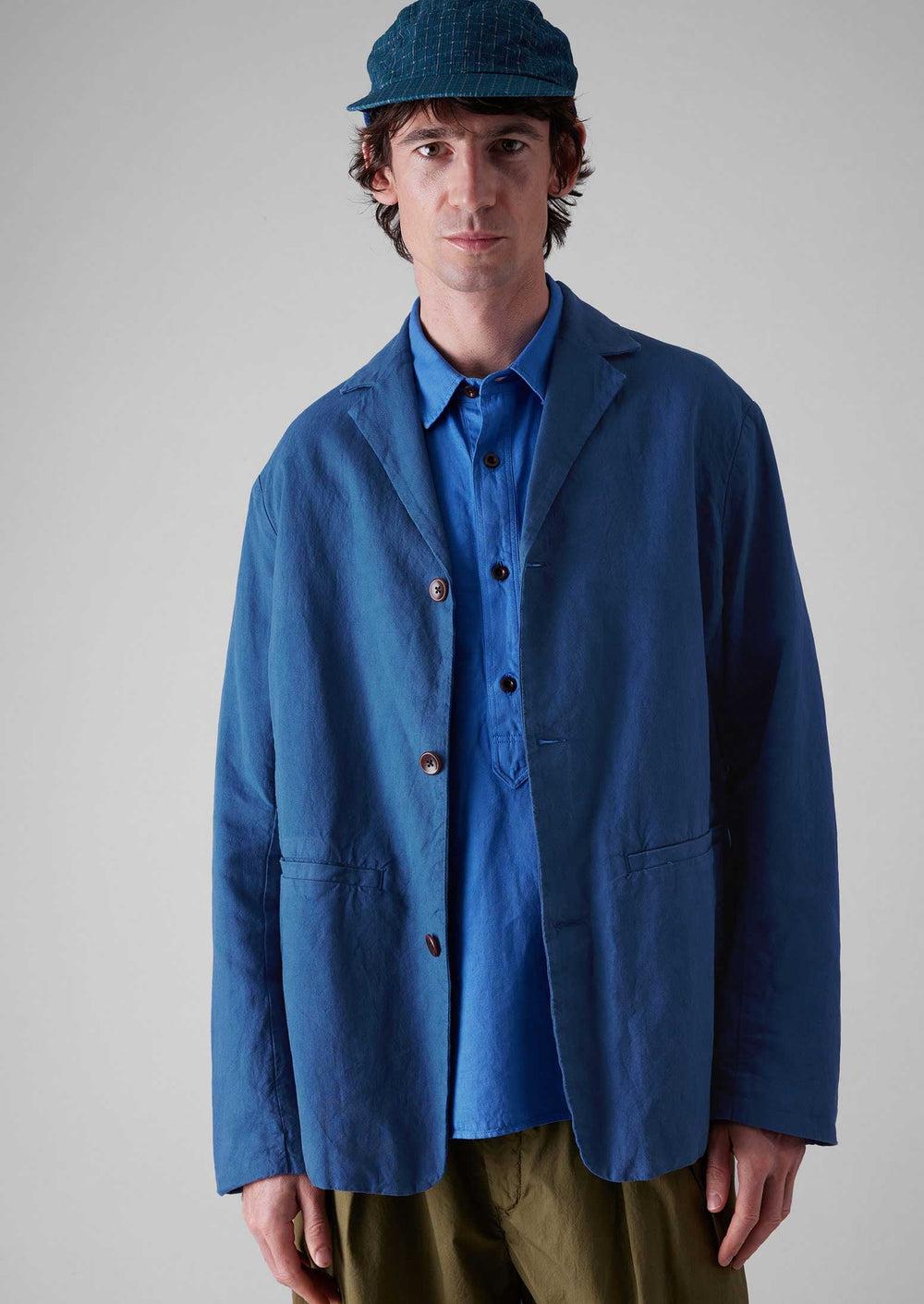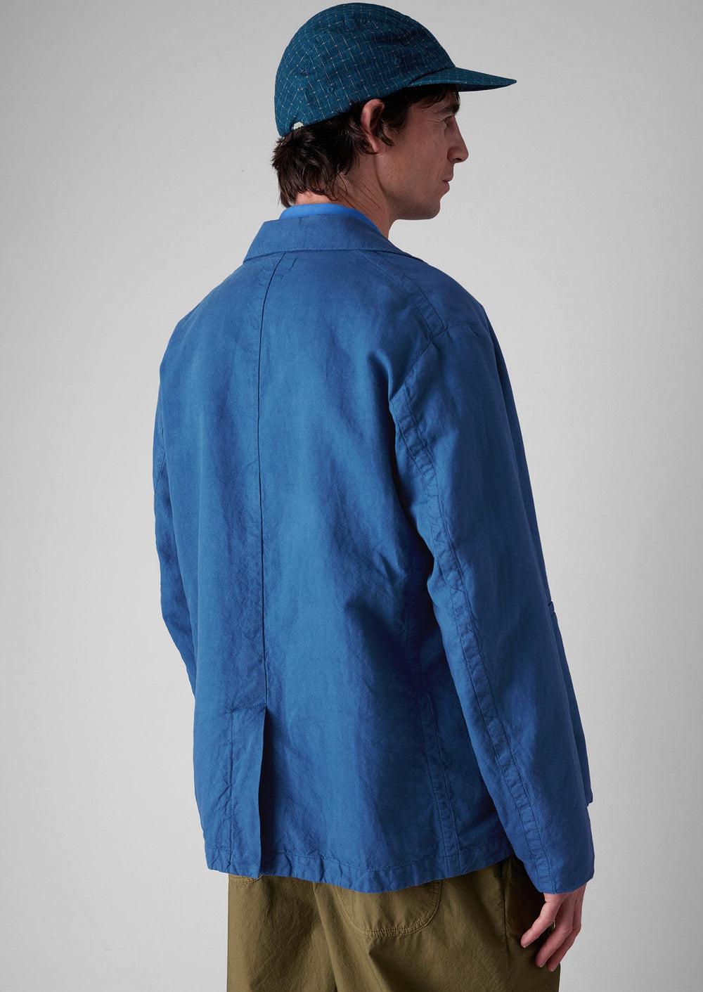 Cotton and linen blend. Garment-dyed. Welt pockets. Half lined. Internal cotton binding. Back slit. Horn buttons.