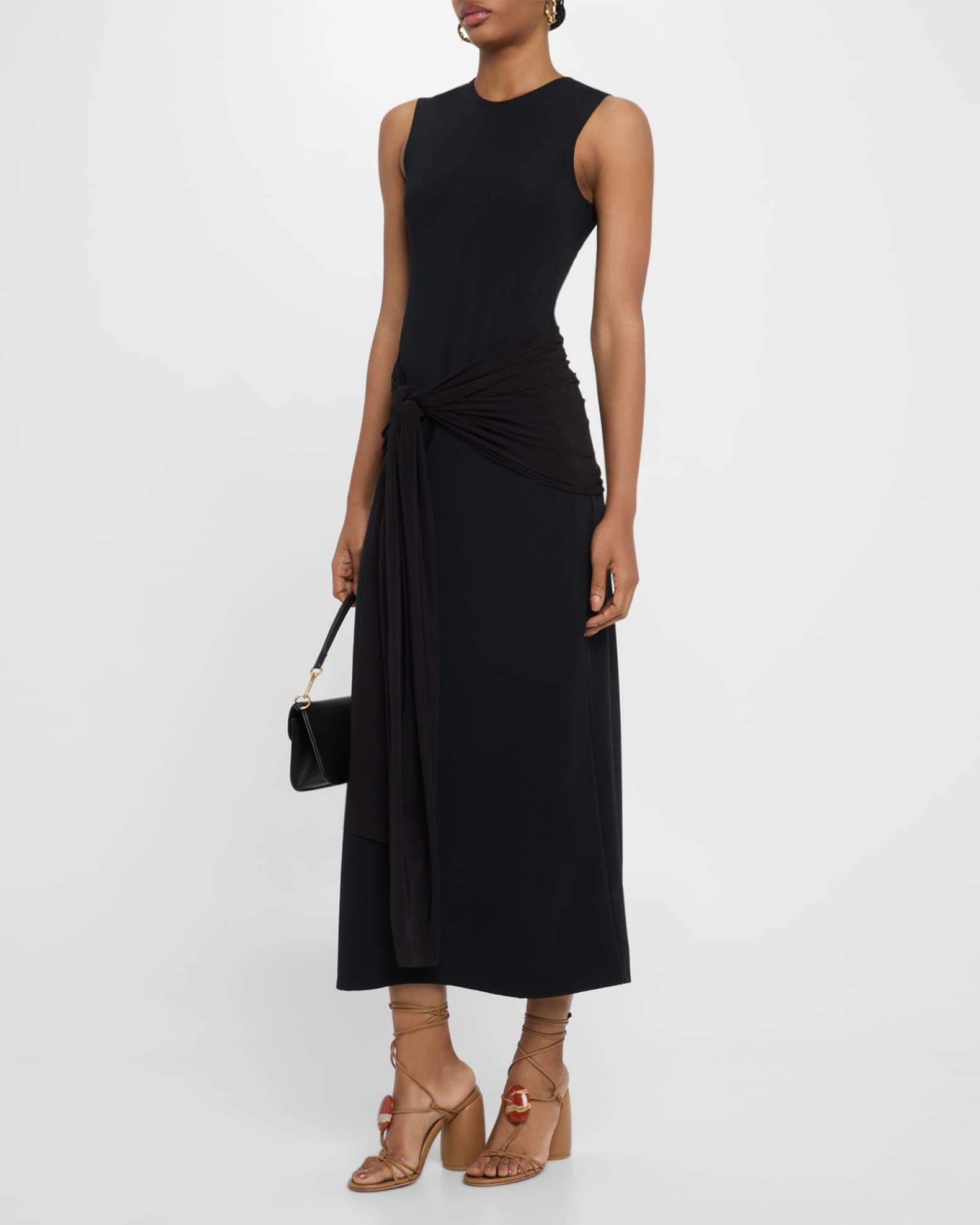 JBQ "Rory" dress adorned with a knotted self-tie waist and flattering back ruching Approx. 55"L from shoulder to hem Crew neckline Sleeveless Hem falls below the knee Sheath silhouette Invisible back zipper Polyester/spandex Made in USA from imported materials
