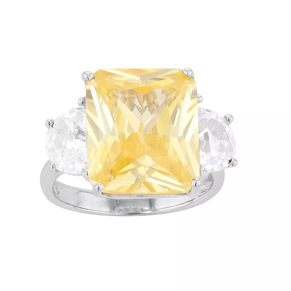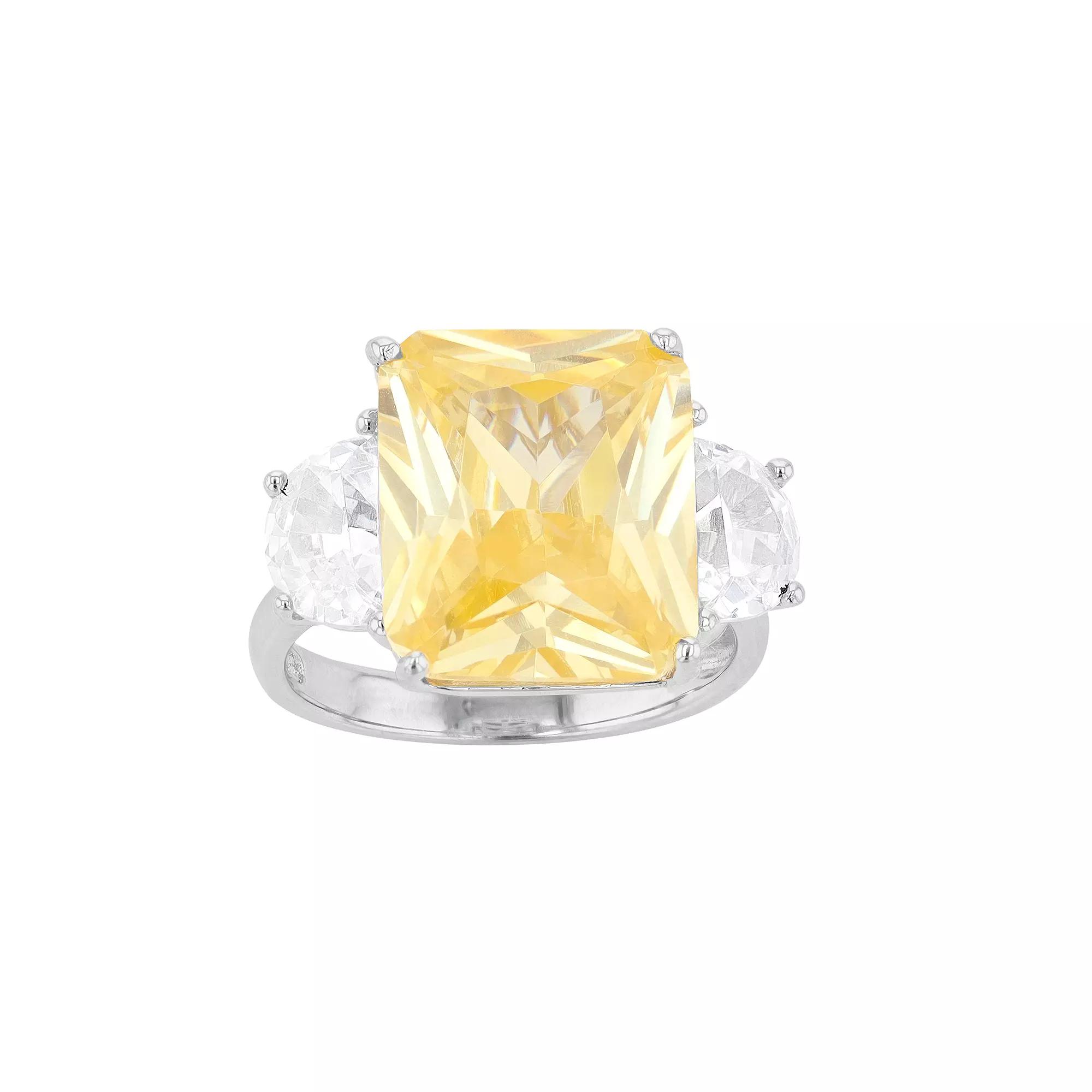 Add a stylish touch to your favorite outfits whenever you wear this yellow and white cubic zirconia ring. Add a stylish touch to your favorite outfits whenever you wear this yellow and white cubic zirconia ring. FEATURES Width: 2.9 mm Shank style: 3-stone Band fit: half-round Nickel free Metal: sterling silver Plating: rhodium Finish: polished Packaging: boxedSTONE DETAILS Stone type: cubic zirconia Center stone size: 14 mm x 12 mm Shape: emerald cut Setting: prong Gemstones may have been treated to enhance their appearance. Special care may be required. Please visit our Gemstone Treatment & Special Care Guide for more information. Size: 6. Gender: female. Age Group: adult.