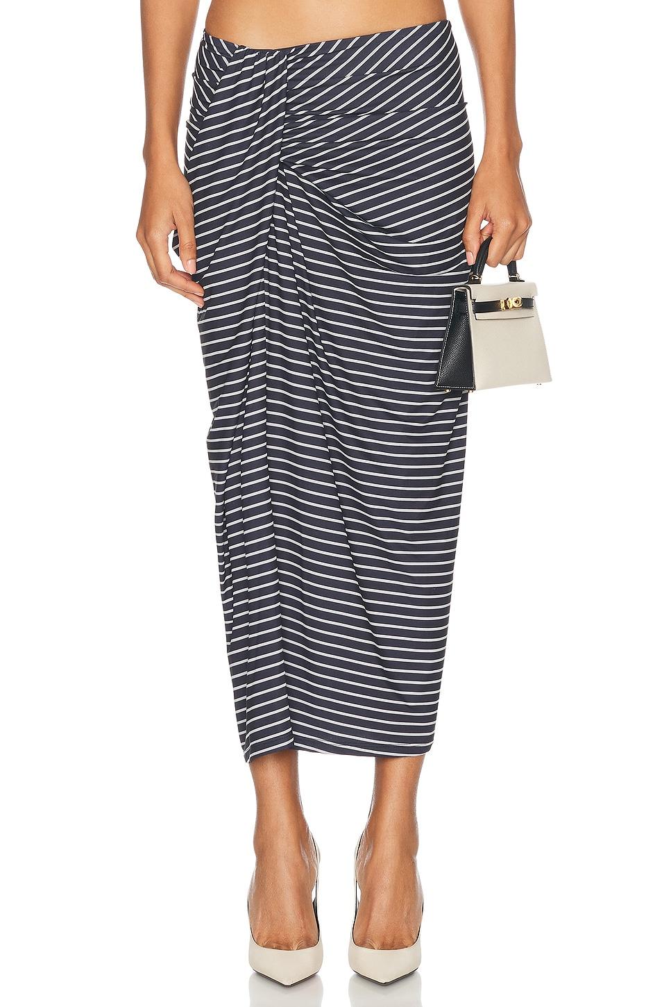 midi skirt90% polyester, 10% spandex / Made in China / Dry clean only / Unlined / Pull-on styling / Gathered fabric design at front / Jersey fabric / Our Style No. RONR-WQ187 / Manufacturer Style No. 4019048PTJ / Model is wearing size Zinta Polo.