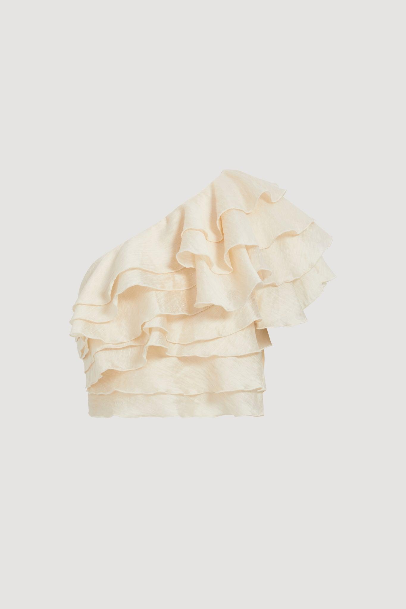 PRODUCT DETAILS One shoulder top Asymmetric neckline Layered frills throughout Fitted bodice Zip, hook and eye closure 50% Tencel, 38% Linen, 12% Nylon Shop All...