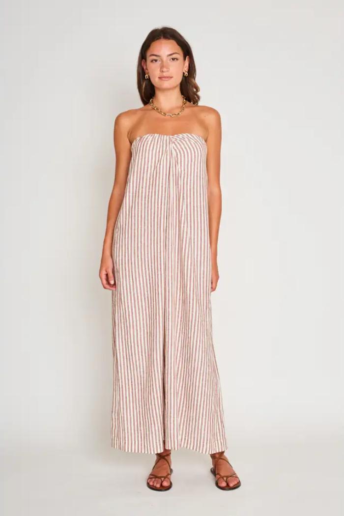 The Rosalyn Striped Strapless Dress embodies effortless elegance with its breezy silhouette and timeless design. Crafted from lightweight, breathable fabric, this dress drapes beautifully, offering comfort without compromising style. The strapless neckline highlights your shoulders, while the flowing shape adds graceful movement with every step. Vertical stripes elongate the figure, enhancing its flattering appeal. Thoughtfully designed with side pockets for convenience, this dress is perfect for sun-soaked vacations, casual brunches, or barefoot strolls along the beach. Style it with strappy sandals and statement jewelry for a relaxed yet refined look.