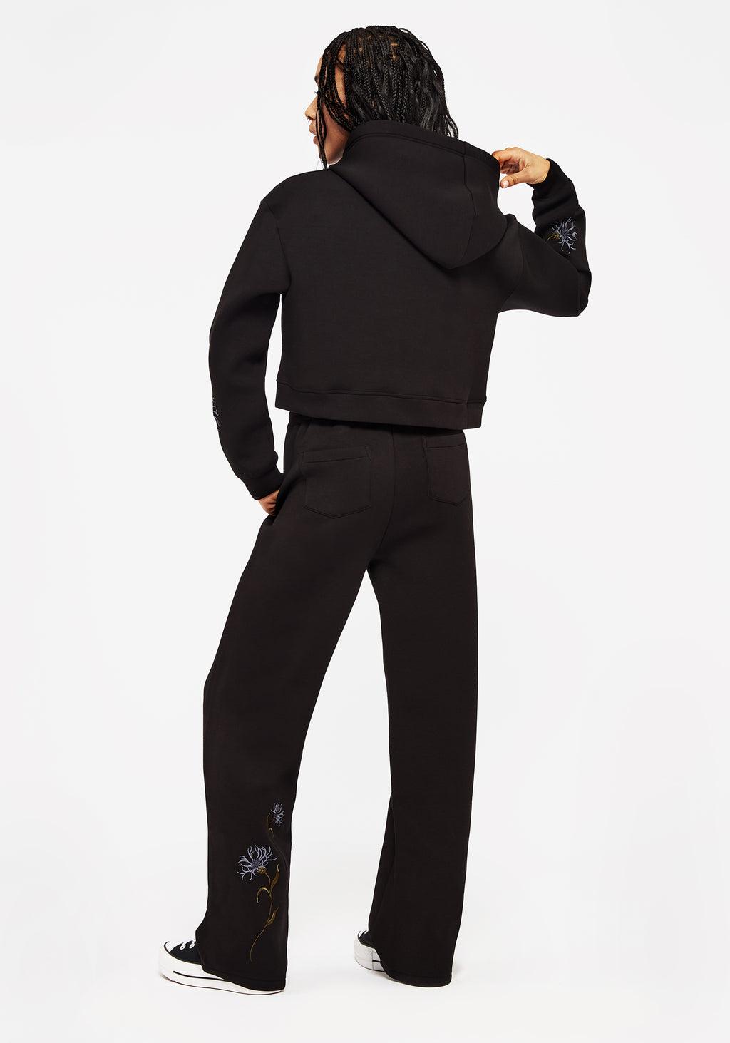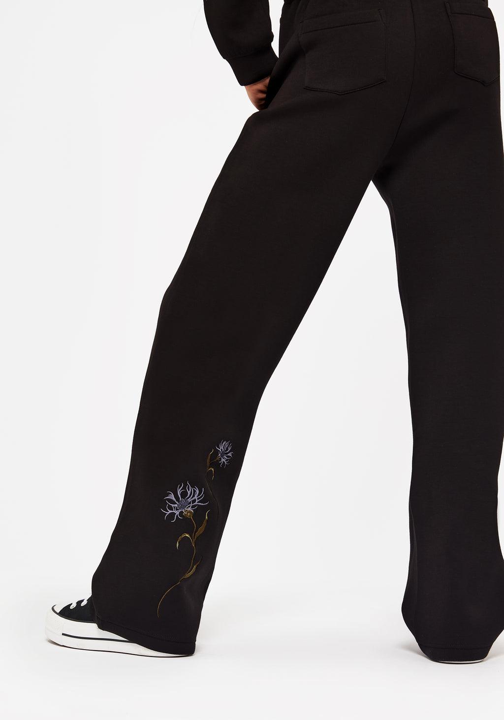 A heavy petal moment - Black floral embroidered wide leg joggers - Elasticated drawstring waistband for maximum cosiness - Roomy wide legs (to swish) - Two side pockets & two back pockets for essentials - Spongy stretch scuba fabric is comfy but sleek - Blue floral embroidery adorn legs - Co-ords with our Rosanella Floral Embroidered Crop Hoodie 75% viscose, 17% polyamide, 8% elastaneOlympia is 5'5" and is wearing a UK6/ US2