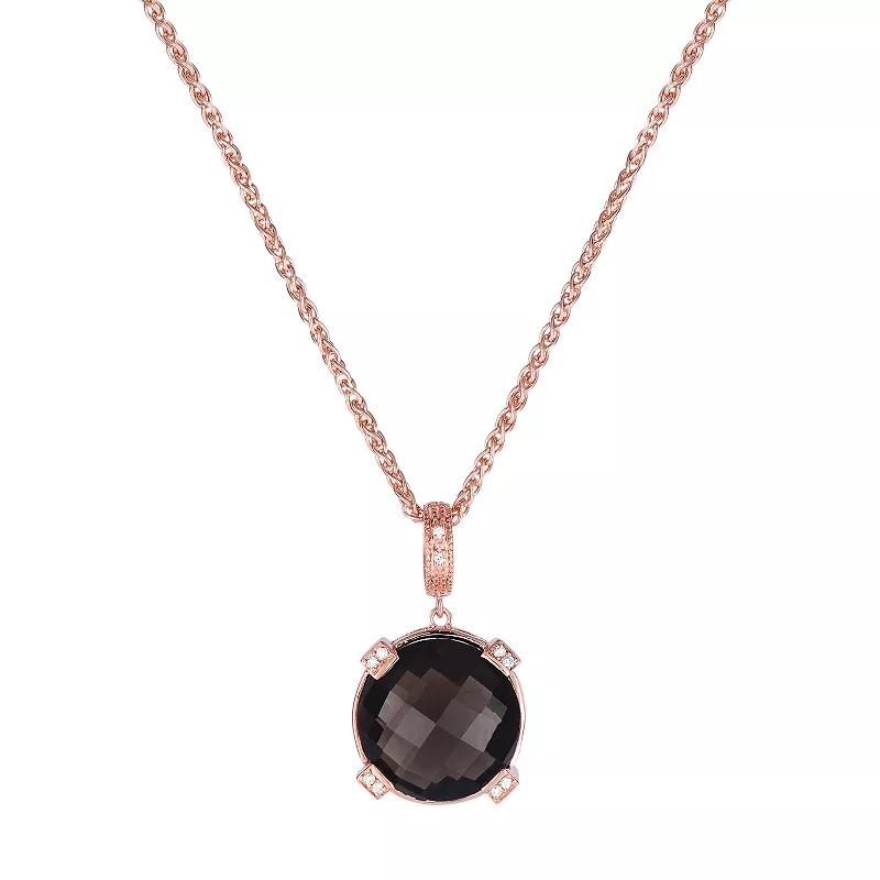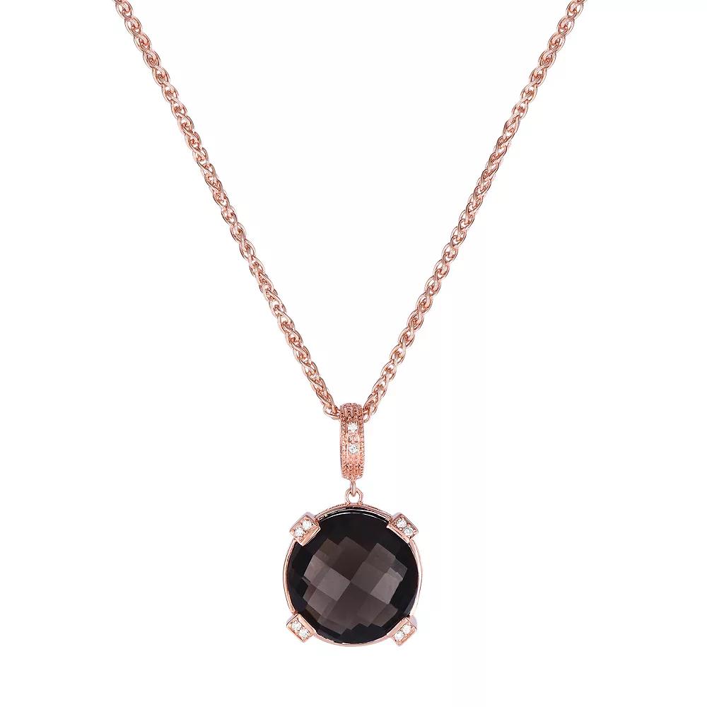 Decorated with a round-cut genuine smoky quartz center stone and diamond accents, this necklace exudes elegant beauty. PENDANT DETAILS Pendant length: 0.51 in. Chain length: 18 in. Chain type: wheat Clasp: spring-ring Metal: sterling silver Plating: rose gold tone Finish: polished Packaging: boxed STONE DETAILS Stone type: smoky quartz Total weight: 5 ct. Center stone size: 12 mm Shape: round Setting: prong DIAMOND DETAILS Total weight: less than 1/10 ct. Shape: round Color grade: I Clarity: I2-I3 Setting: prong Gemstones may have been treated to enhance their appearance. Special care may be required. Please visit our Gemstone Treatment & Special Care Guide for more information.Image(s) may be enlarged to show detail.Diamond weights are approximate. Diamond total weights may vary between .01 and .08 ct. Some diamonds have fewer than 17 facets. Color: Brown. Gender: female. Age Group: adult.