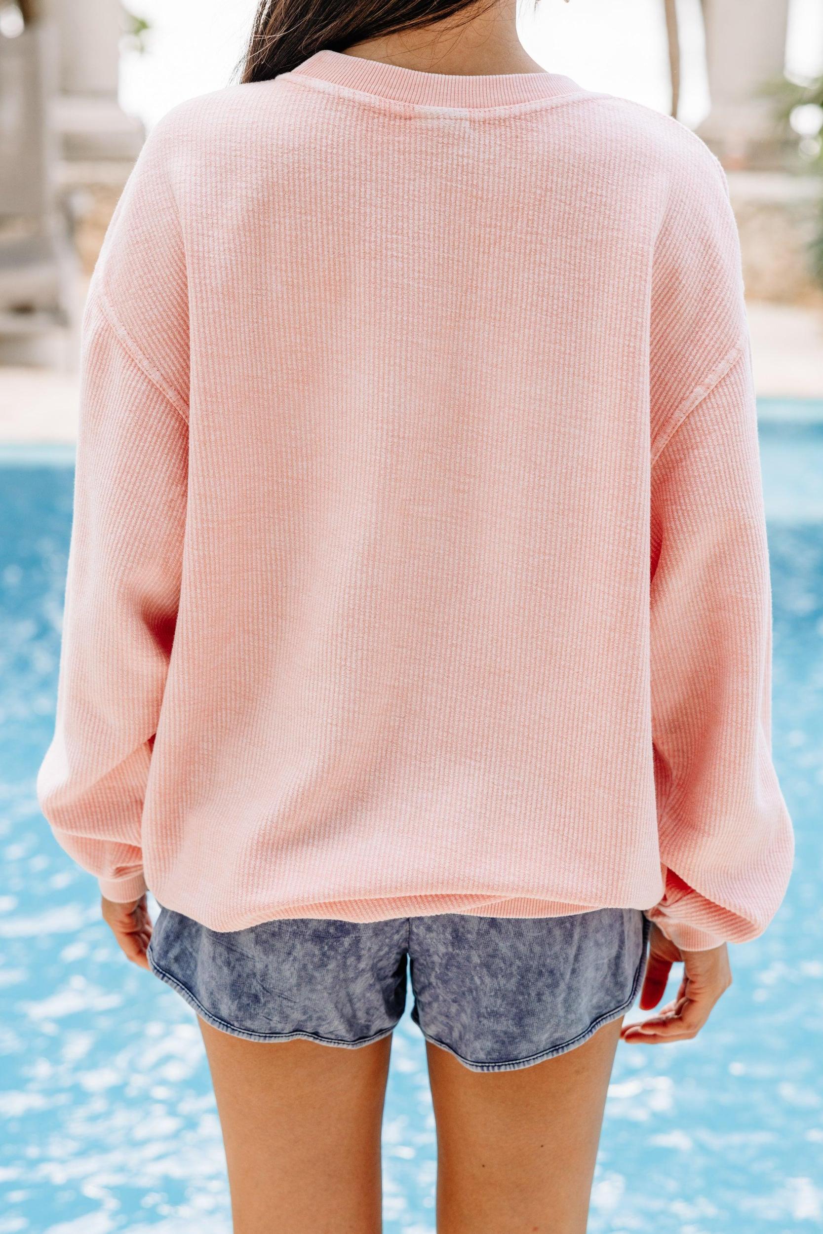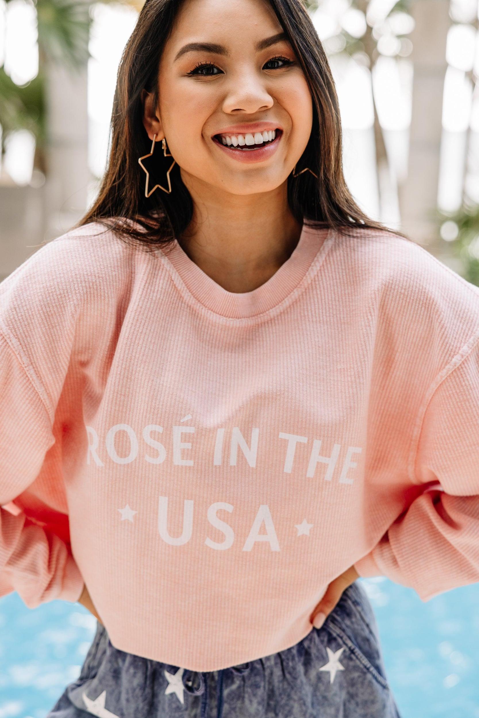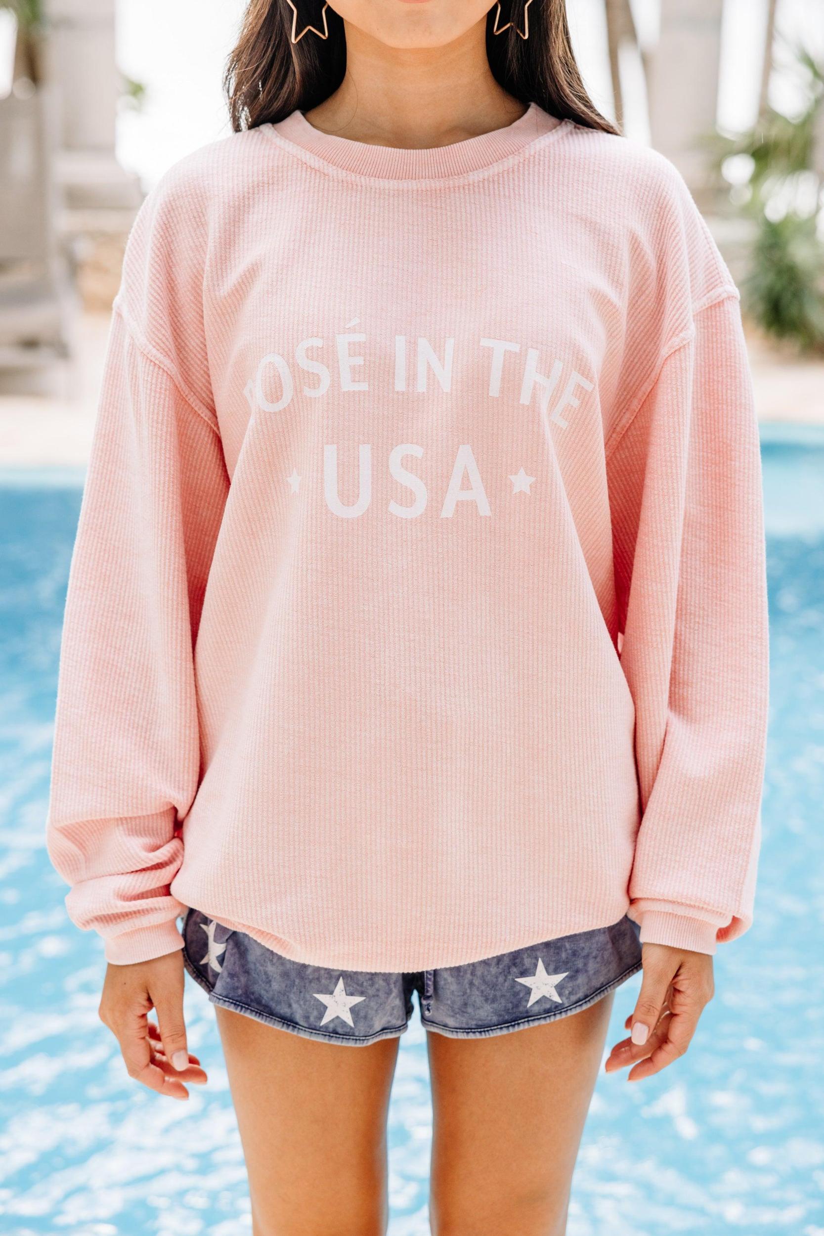 Yes, honey! Rosé in the USA baby! This graphic sweatshirt is so cute and sassy! We love the colors too! This sweatshirt is going to be perfect for pairing with shorts and over swimmies all summer long! This sweatshirt features a crew neckline, corded fabric, long sleeves, and a cute graphic. *Due to the vintage wash, colors may vary garment to garment making each one unique. Material has a generous amount of stretch.Cindy is wearing the small.
