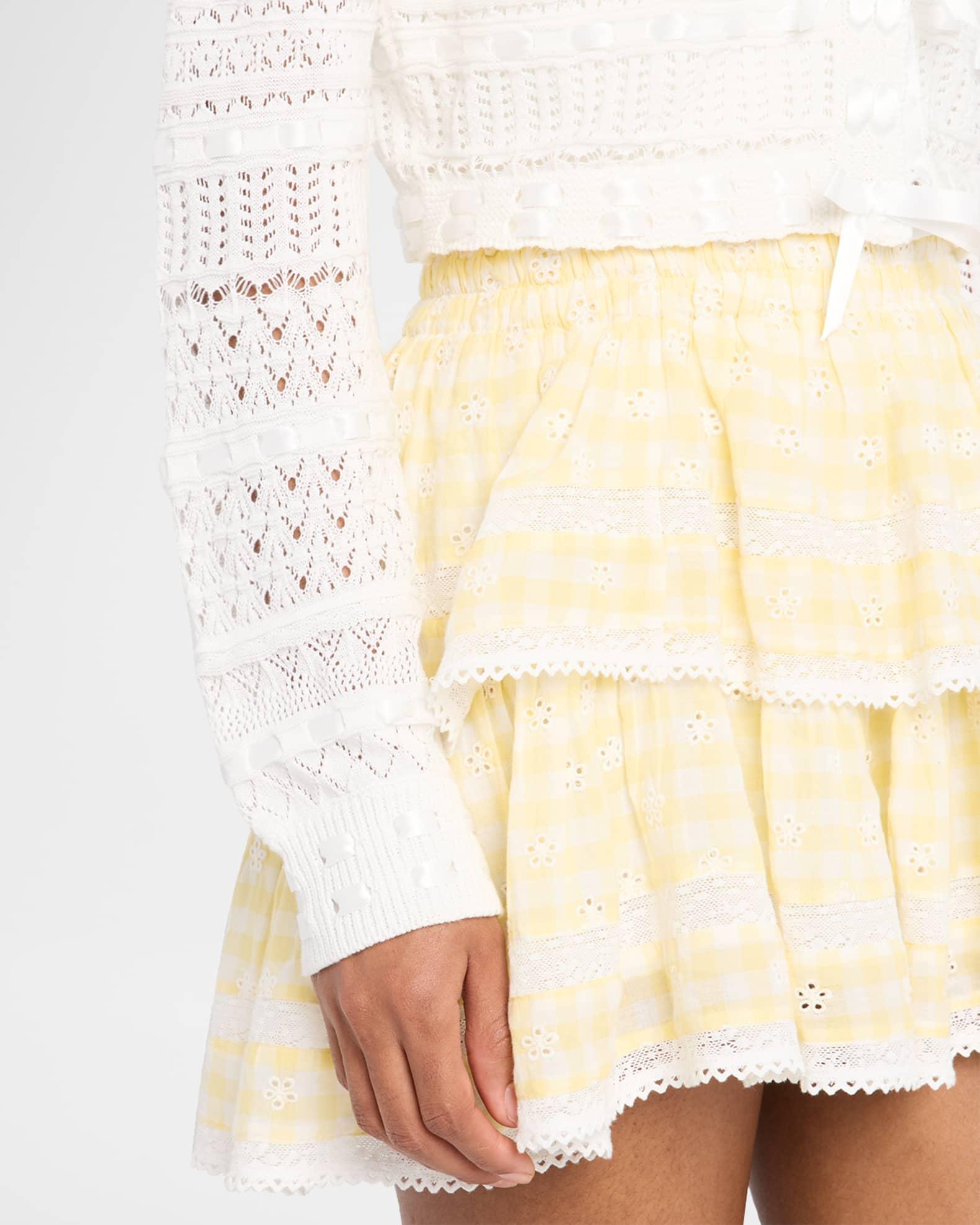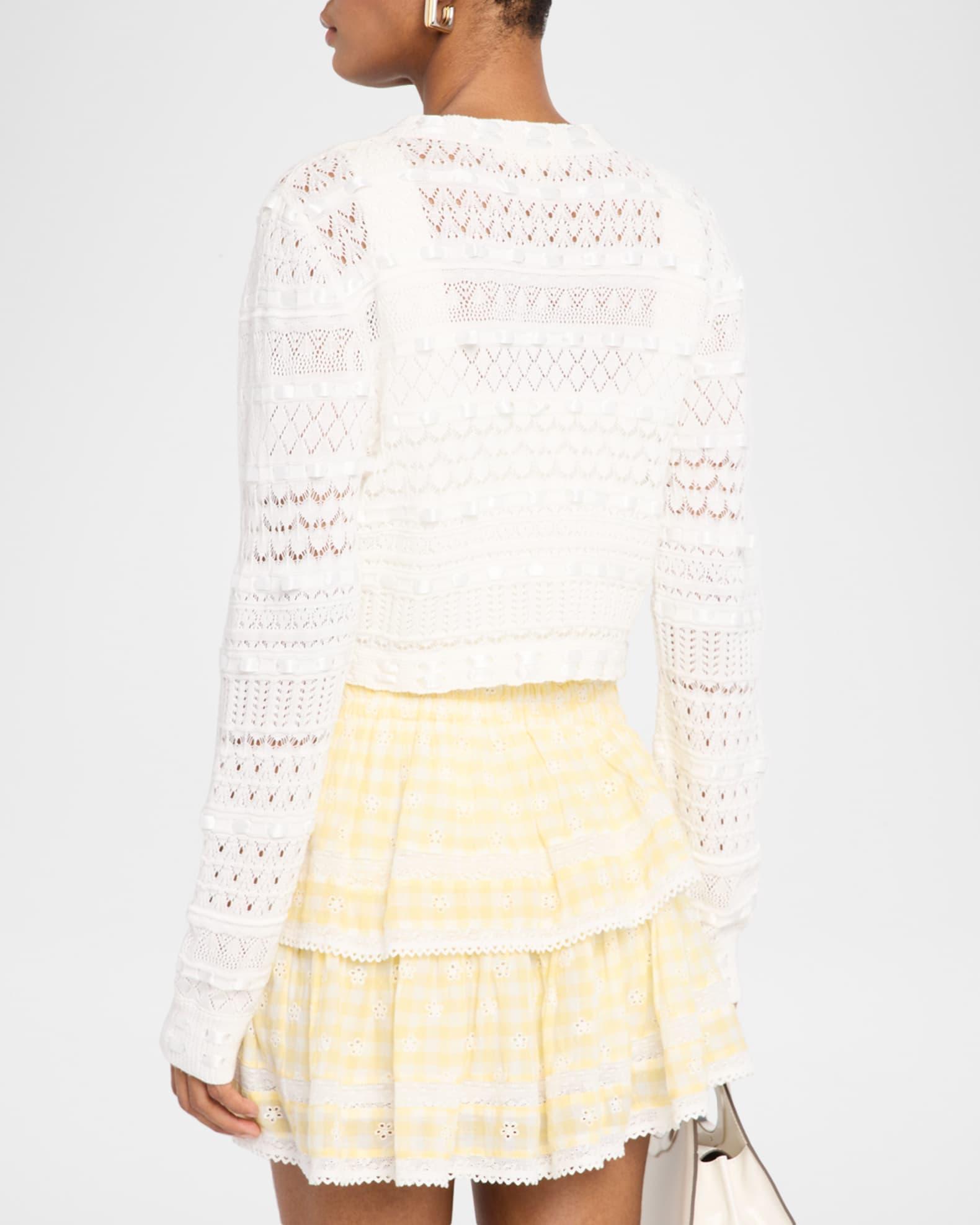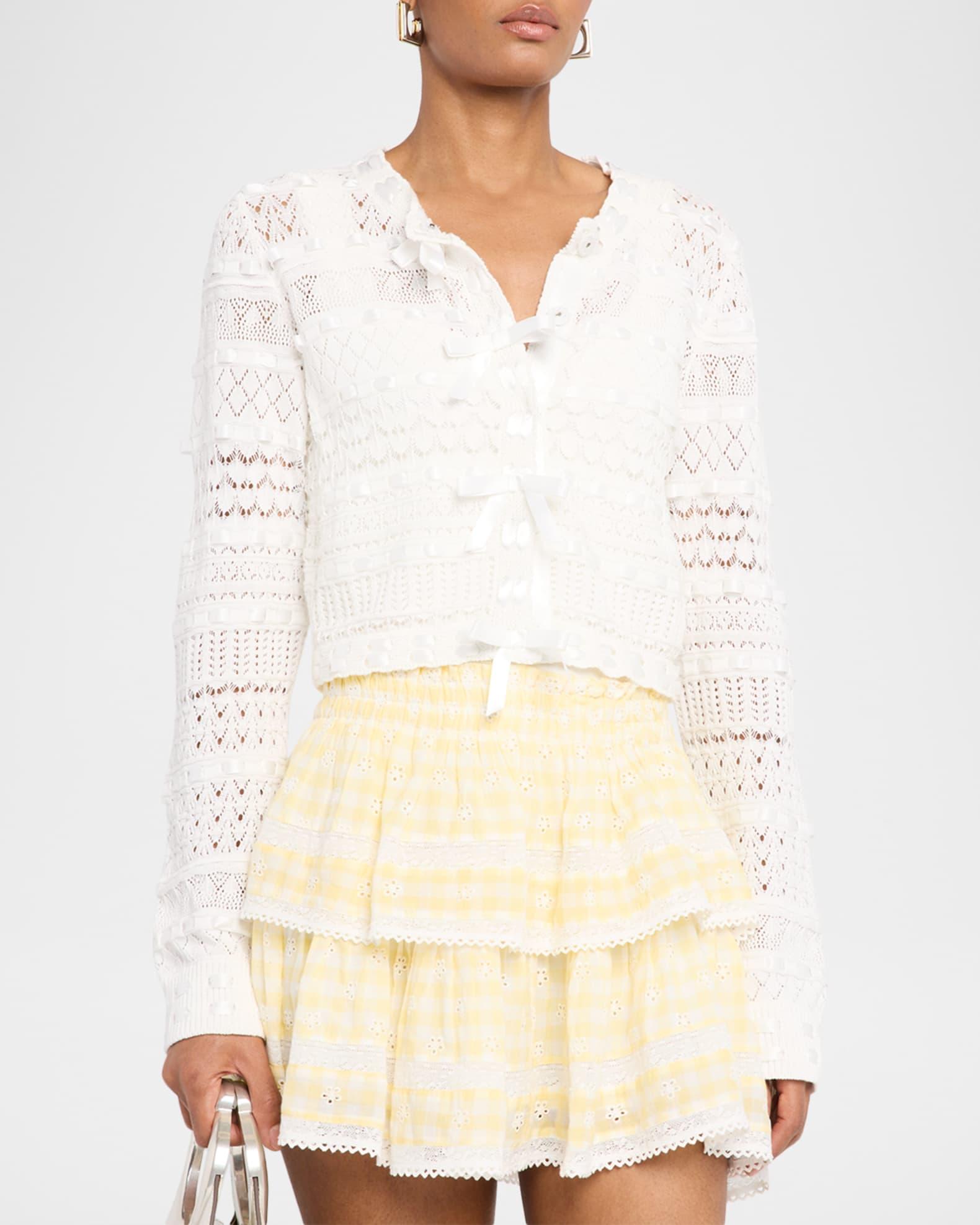 LoveShackFancy "Roselline" lightweight cotton cardigan with delicate pointelles allover and a satin ribbon woven throughout Approx. 16"L from shoulder to hem Crew neckline; hidden snap closures covered with delicate grosgrain bows Long sleeves Slim fit Cropped hem Ribbed cuffs and hem Cotton Unlined Dry clean Imported