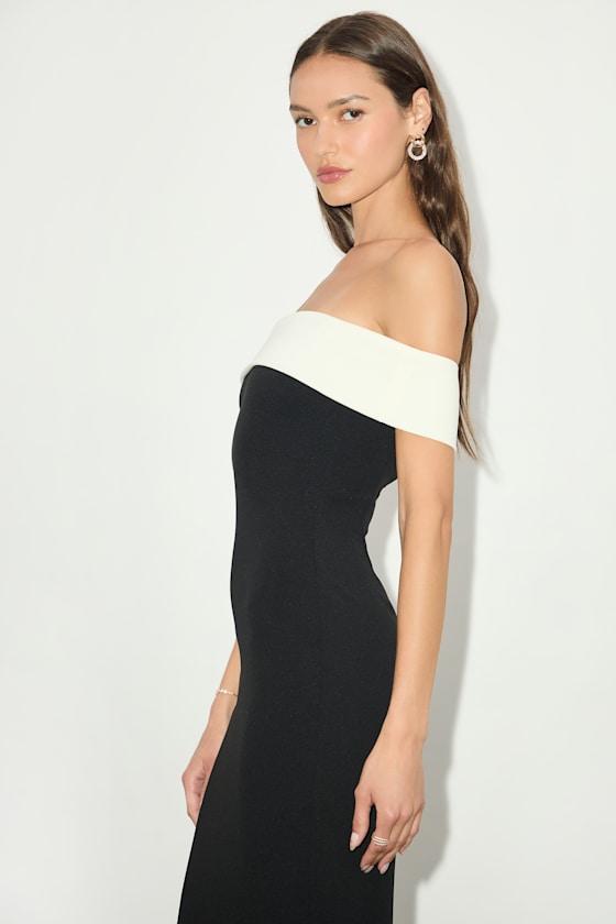With a sophisticated off-the-shoulder silhouette and a figure-flaunting fit, it's so understandable to be obsessed with how you look in this stunning crepe knit dress. The white foldover trim that accents the princess-seamed bodice not only creates short sleeves, but also a color block effect that is as chic as can be. A midi hem and a kick pleat at the back complete the look. Hidden back zipper/clasp.