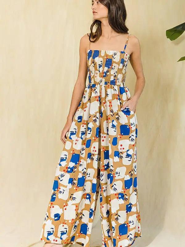 Wide Legs Smocked Floral Print Jumpsuit - Smocking at top with spaghetti strap - Flared legs - Side hidden pockets