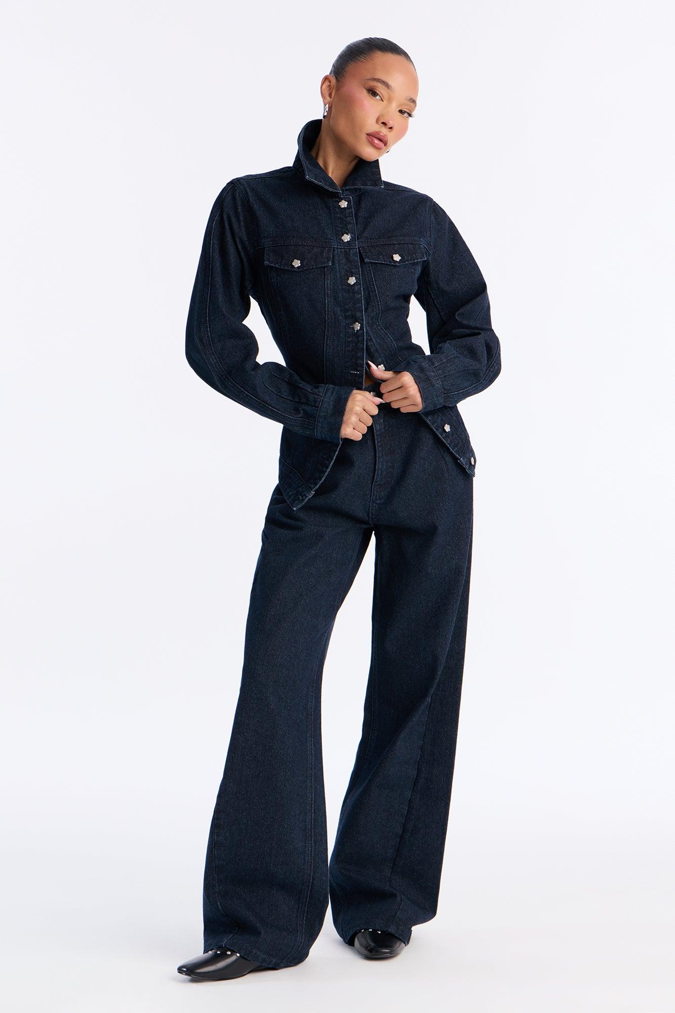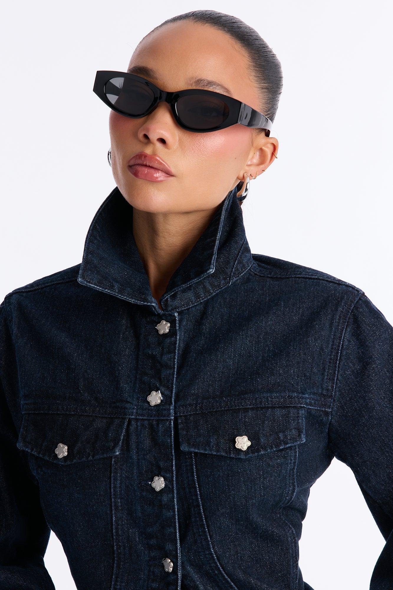 Available In Dark Denim. Denim Shacket Pair With Rosemond Wide Leg Jeans To Complete The Look! Collar Long Sleeve Flower Button Closure Non Functional Pockets 100% Cotton Non Stretch Imported California Proposition 65WARNING: Cancer and Reproductive Harm - www.P65Warnings.ca.gov.