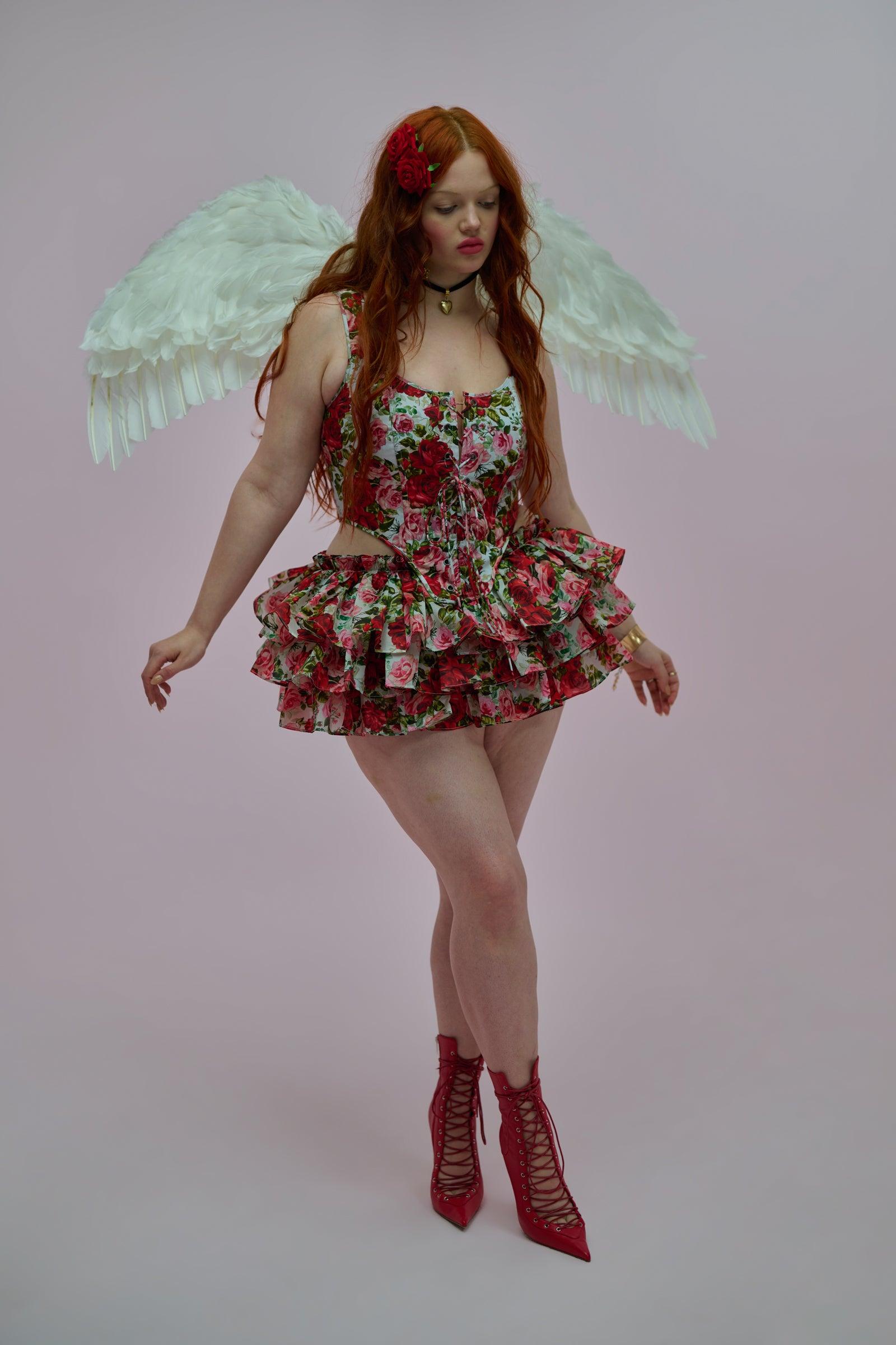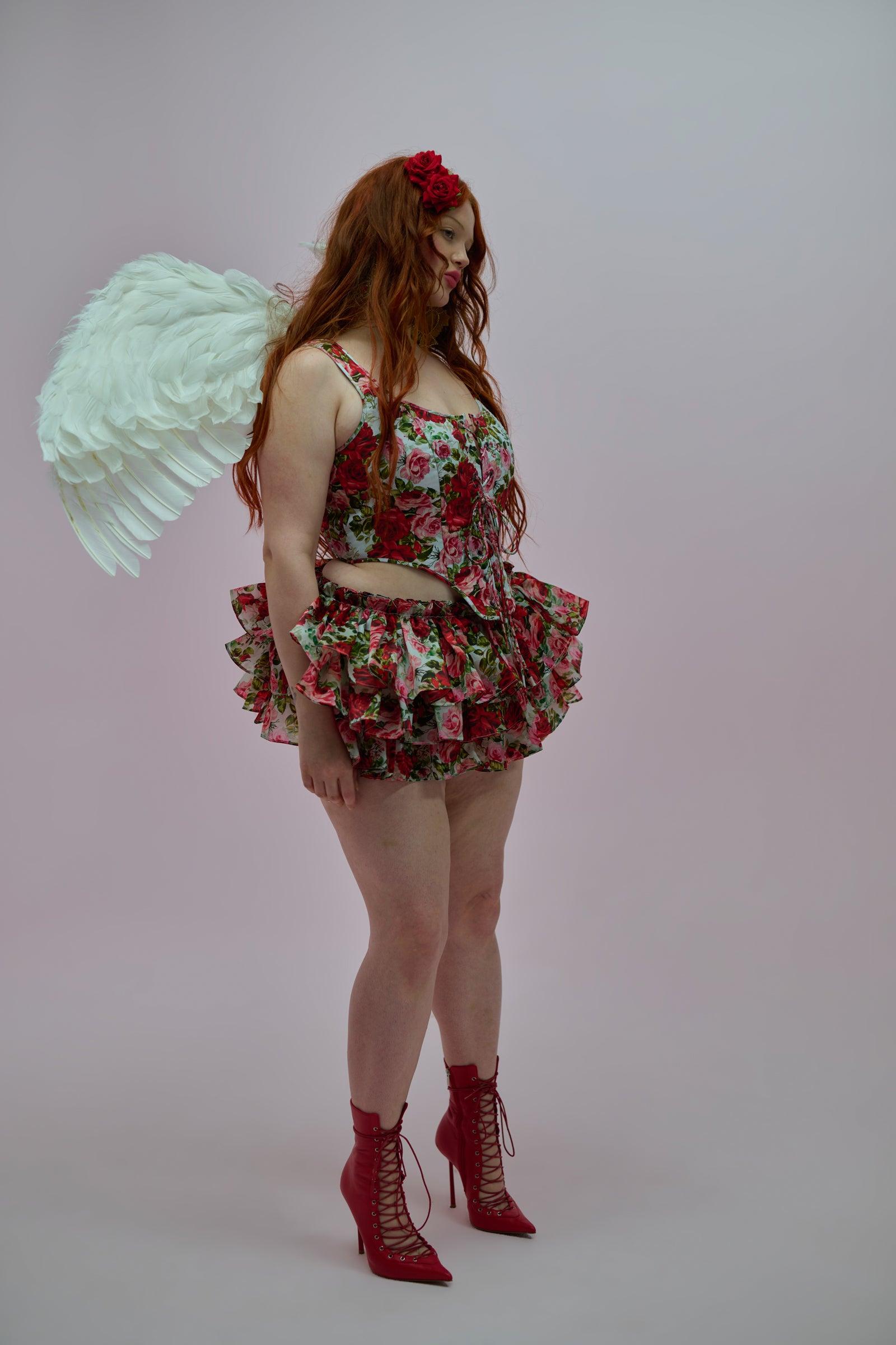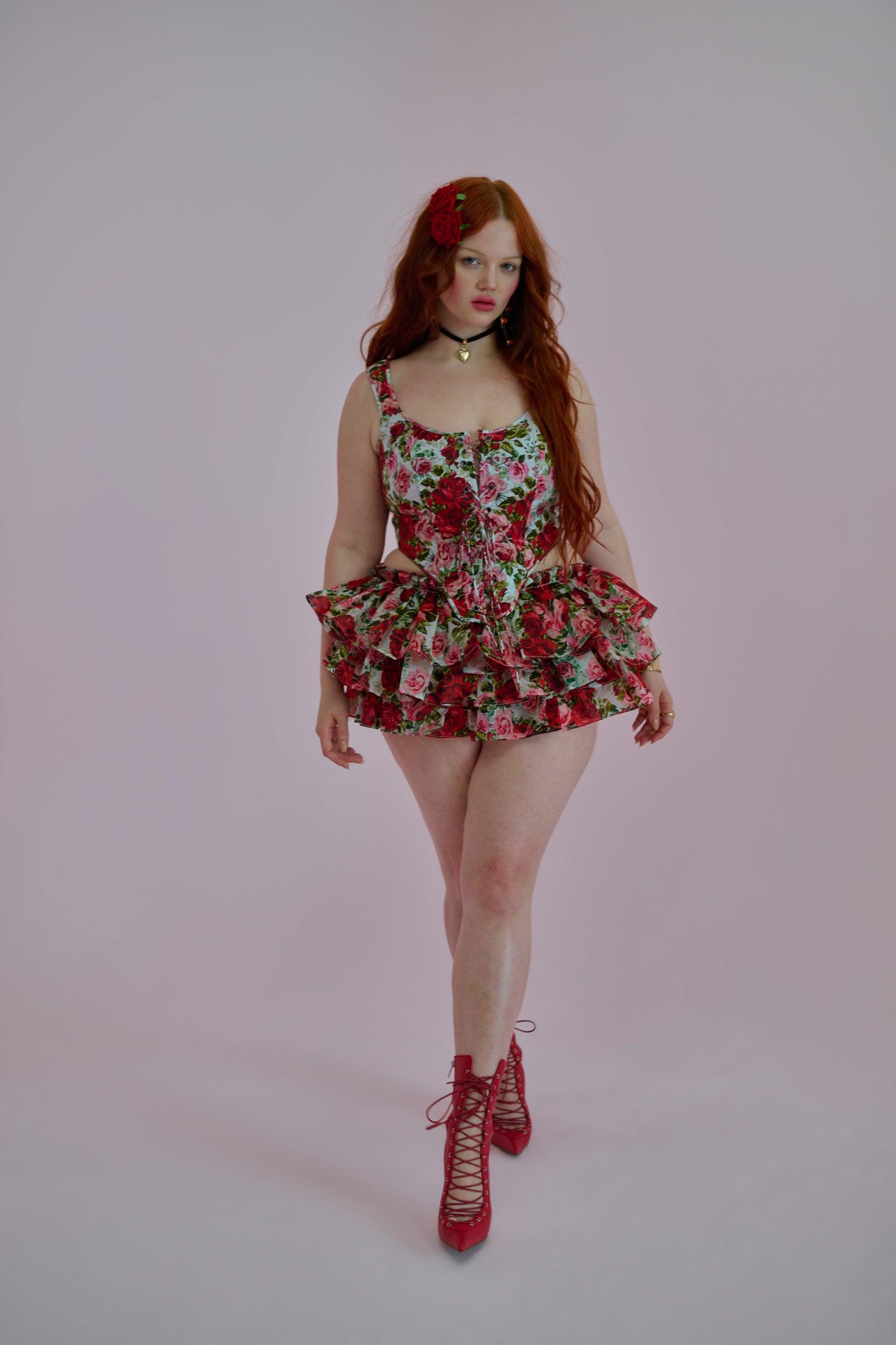 Our Duchess Corset captures the magic of perpetual bloom, featuring Selkie founder Kimberley Gordon's classic rose print, inspired by Alice's wonderland where roses are painted crimson red. This fully boned masterpiece in 100% heavy cotton features dual draw cords for customizable cinching, creating a silhouette worthy of garden tea parties year-round. Heavy cotton lace-up bodice corset Includes two draw chords Boning for structure Double lined with heavy cotton To ensure the best fit, measure your across bust and high waist before ordering and steam for optimal beauty. Finley is 5’9.5” and wearing a size XL in Selkie. Her measurements are 39” bust, 33” waist, 47” hip. Mia is 5’8” and wearing a size XS in Selkie. Her measurements are 30.5” bust, 23.5” waist, 36” hip. Charlie is 5’10.5” and wearing a size 2X in Selkie. Her measurements are 51” bust, 44” waist, 48.5” hip. Fabric: 100% Heavy Cotton