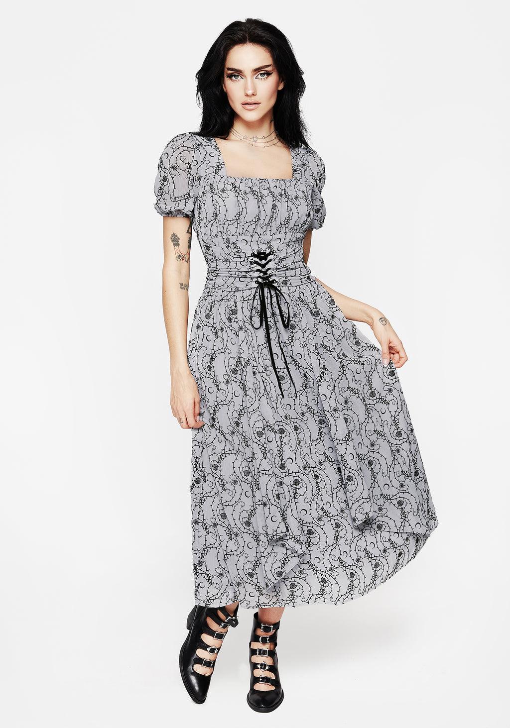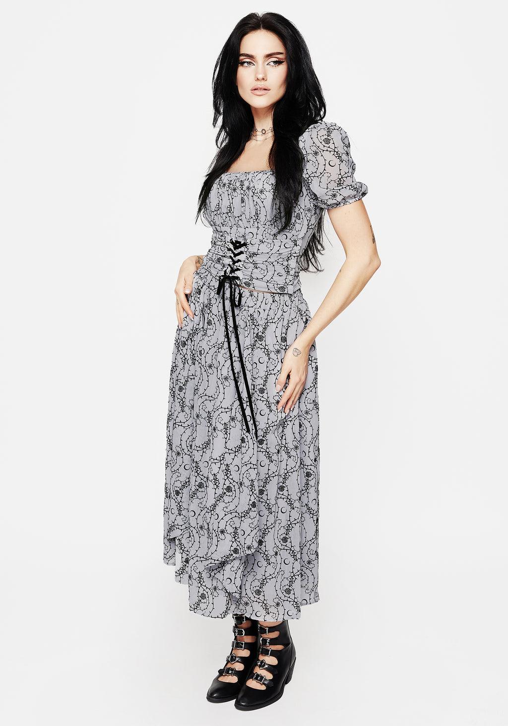 There's no rose without a thorn...- Blue floral flocked chiffon crop top - Fitted top in a cropped length - Statement squared neckline & back secured with self-fabric halterneck ties - Corset-inspired lace front features black velour ribbon threaded through rivets - Elasticated ruching at back for all-day comfort - Sheer crinkle chiffon fabrication with a solid stretch jersey lining - Black flocked velour rose, thorns & moon design on a soft slate blue grey base - Pair this soft style with black accessories to bring out its dark side Main: 100% polyesterLining: 93% polyester, 7% elastane