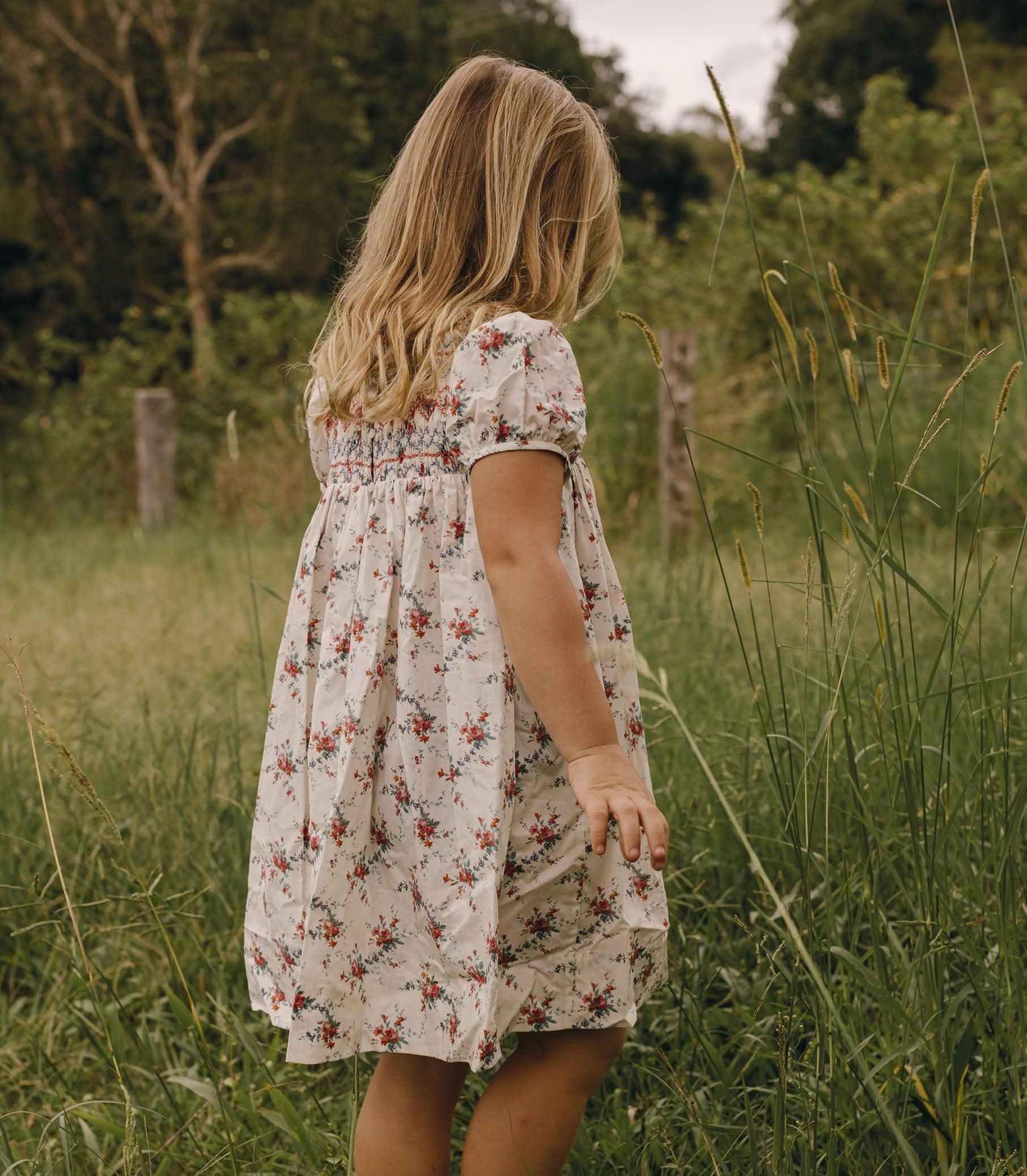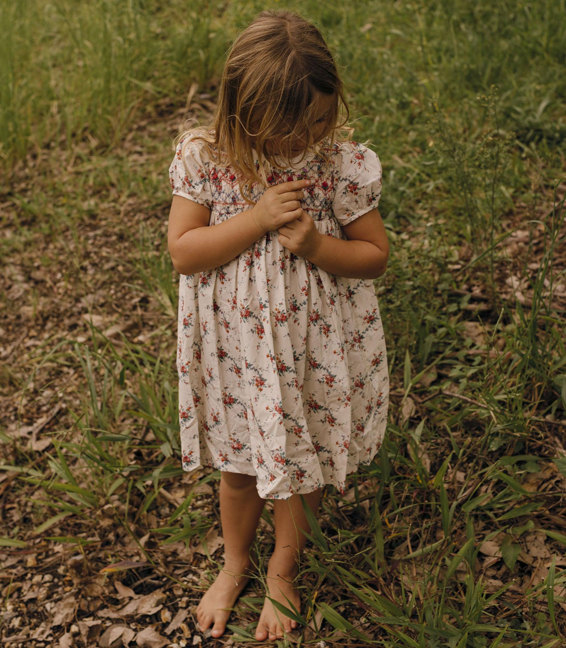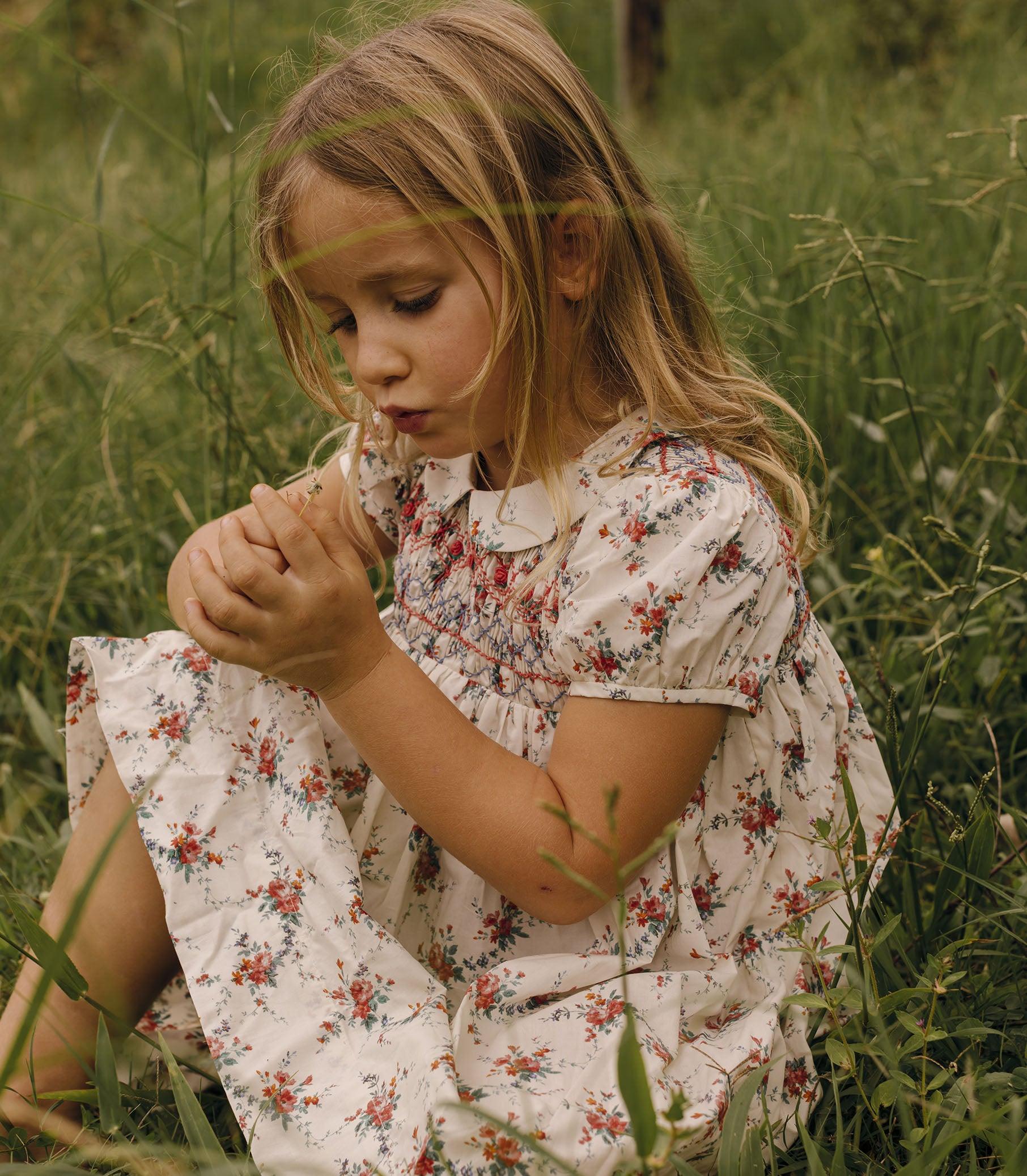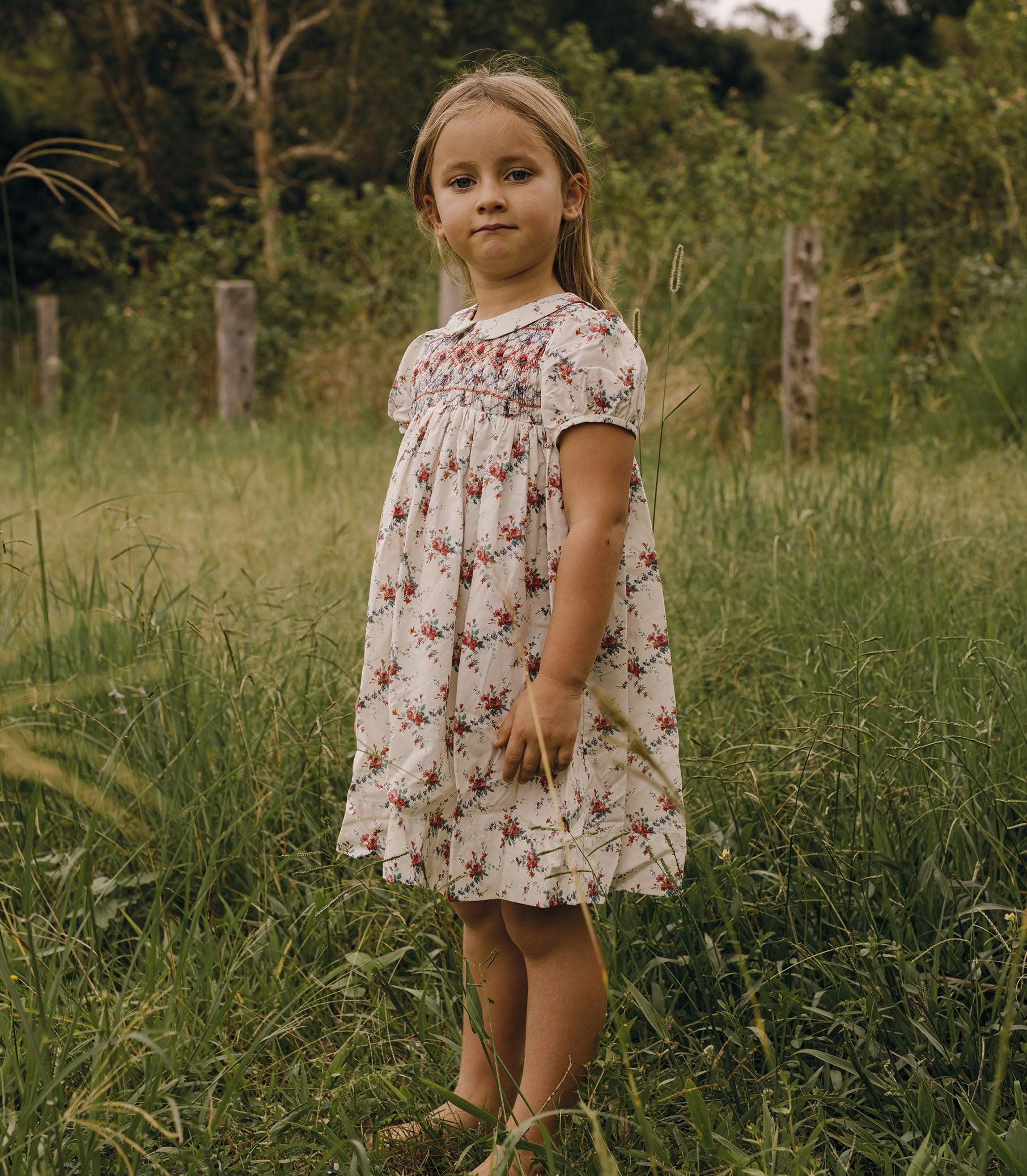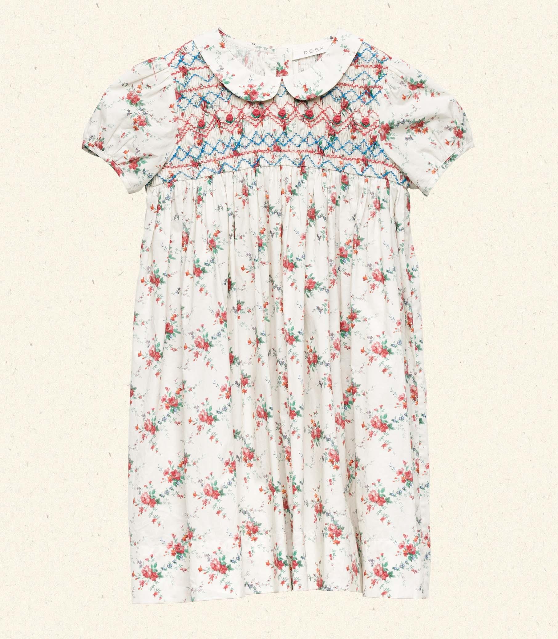 Crafted from a crisp cotton lawn and rendered in Alessia Rose, an archival Liberty Fabrics floral from the 1860s with delicate clusters of roses, tiny blossoms, and trailing foliage, the Rosette Dress features a Peter Pan collar, short puffed sleeves, and hand-embroidered rosettes and smocking at the bodice. A full skirt falls to just above the knee, while four buttons fasten at the back of the neck.