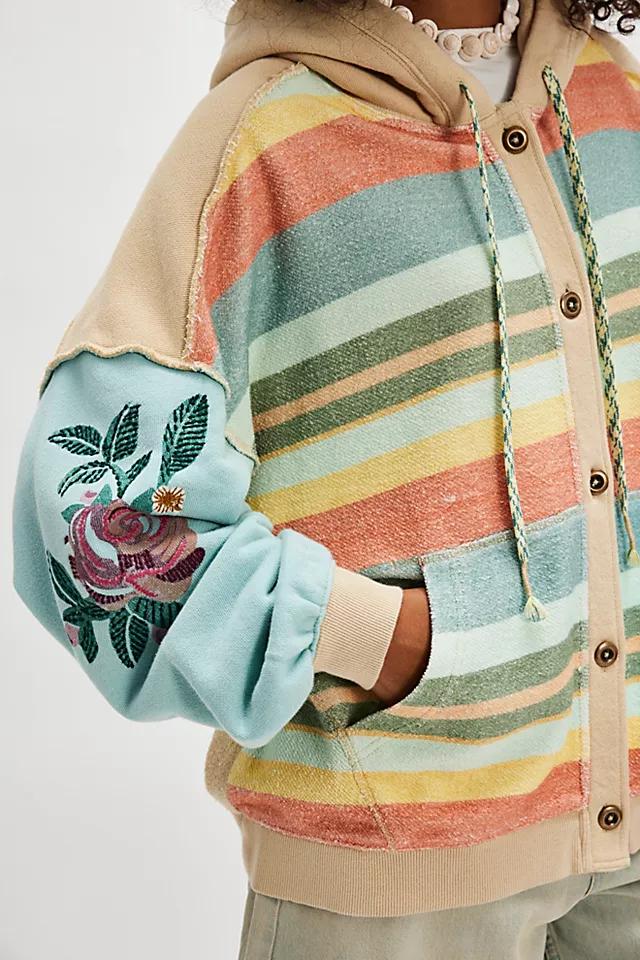 Bring the beachy vibes to any look with this oversized cardigan, featured in a printed cotton terry with a striped bodice and floral-embroidered sleeves.